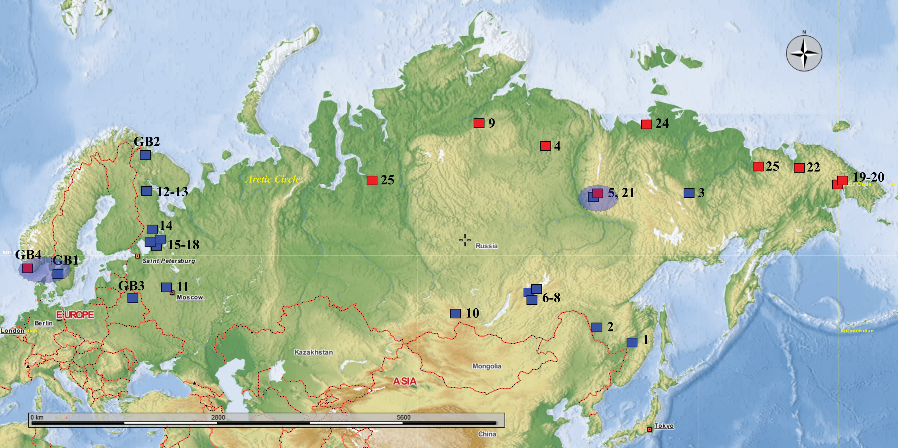 Рис. 1. Карта распределения видов D. cristata (синие квадраты) и D. longiremis (красные квадраты) на территории Северной Евразии. Сиреневым цветом выделены места совместного или близкого обитания видов. Номера соответствуют местам отбора проб в приложении табл. 1. GB1–GB4 – точки отбора проб для образцов из базы данных GenBank (NCBI).