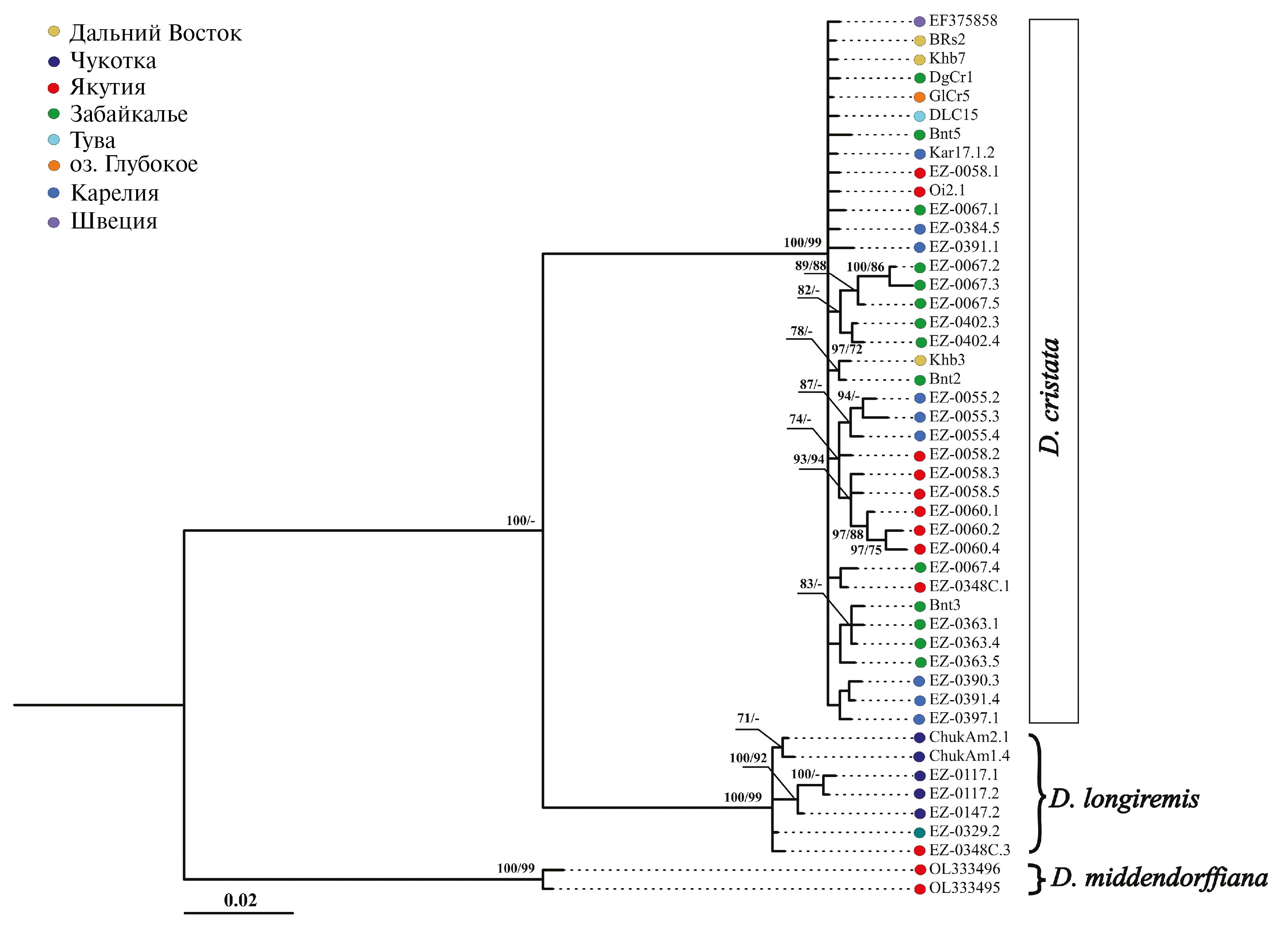 Реконструкция филогенетического дерева выполнена на основе фрагмента гена 12S мтДНК (582–587 пн). В качестве внешней группы в анализе использованы нуклеотидные последовательности D. middendorffiana, номера доступа в базе данных GenBank (NCBI) – OL333495 и OL333496. Кроме того, в анализе использовали ранее полученные последовательности D. cristata и D. longiremis из базы данных GenBank (см. Приложение, табл. S1). Выбор моделей, наилучшим образом описывающих эволюцию изучаемых последовательностей, осуществляли в программе jModelTest v 2.1.7 на основе показателей правдоподобия для 88 разных моделей и информационных критериев Акайке (AIC) и Байеса (BIC) [15, 16]. Согласно проведенному анализу, для фрагмента гена 12S рРНК лучшими моделями были 3-параметрическая модель Тамуры с гамма-распределением (TN92+G, параметр α = 0.619) [17] и General Time Reversible модель с гамма-распределением (GTR+G, параметр α = 0.538) [18]. Первую модель использовали для реконструкции 12S филогении с помощью метода максимального правдоподобия (ML) в программе MEGA v 7.0; поддержку ветвей оценивали по бутстрэп-тесту при числе репликаций 1000 [19, 20]. Вторую модель использовали при реализации байесовского анализа в программе MrBayes v 3.2 [21]. Две синхронные серии, каждая с четырьмя марковскими цепями, запускали для 1 × 106 поколений при частоте записи параметров, равной 500. Стационарность серии подтверждали с помощью мер апостериорной вероятности и логарифмического правдоподобия. Параметры эффективного размера выборки (ESS > 500) для проверки конвергенции марковских цепей и трассировочных графиков MCMC оценивали в программе Tracer v 1.6 [22]. Визуализацию BI-филогении для фрагмента гена 12S мтДНК выполняли в программе FigTree v 1.4.4 (http://tree.bio.ed.ac.uk/).