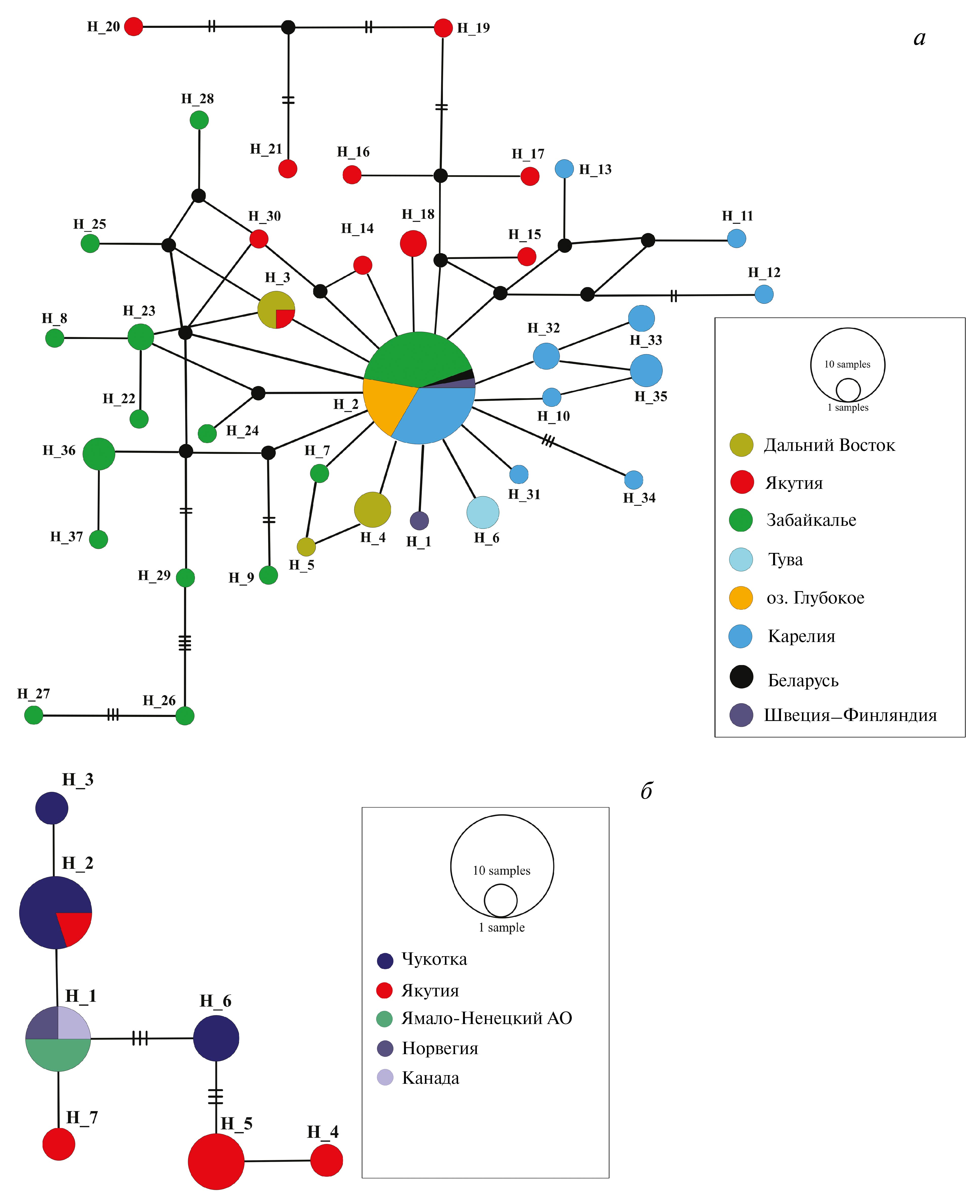 В отличие от медианной сети D. cristata, сеть гаплотипов фрагмента 12S для D. longiremis характеризуется совершенно иным типом связей (рис. 3). Наиболее заметной отличительной особенностью сети является отсутствие широко распространенного центрального гаплотипа. Один общий 12S гаплотип D. longiremis выявлен в популяциях из Якутии и Чукотки (H_2); другой – в популяциях из Канады, Норвегии и Ямало-Ненецкого АО (H_1). Гаплотипы H_4 и H_5 из Якутии, гаплотип H_6 из Чукотки формируют удаленную ветвь, связанную с остальной группой гаплотипов через 3–7 мутационных шагов (см. рис. 3).