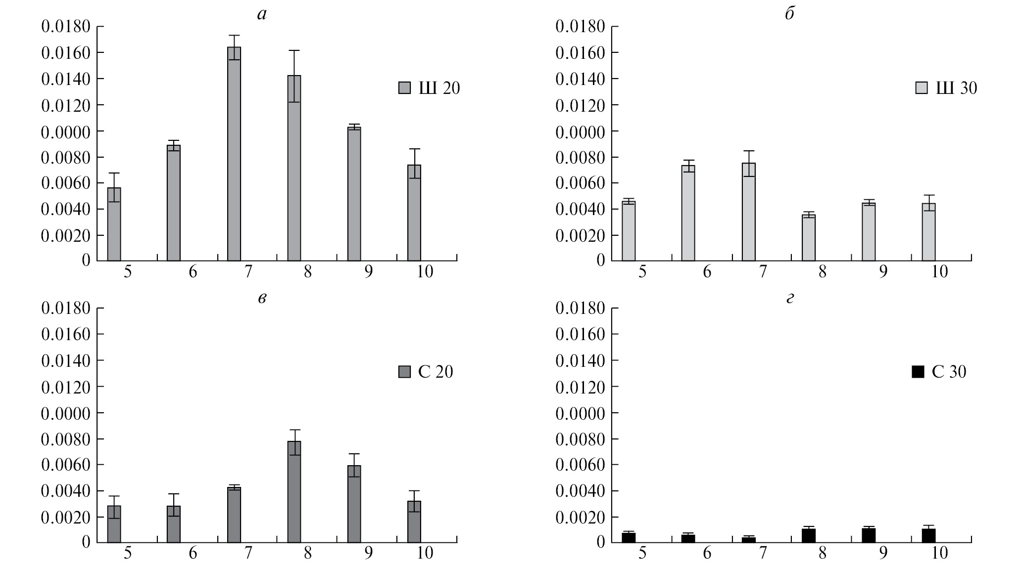 Рис. 4. Динамика транскрипционной активности CCA1 у растений A. thaliana популяции Шуйская при выращивании их в условиях инвертированного светового режима 8D : 16L (свет продолжается с 17 ч до 9 ч утра). а – растения росли в условиях естественного светового фотопериода (16L : 8D) (Ш20) (данные приведены из рис. 1 для сравнения); б – 30-дневные растения только последние 10 дней росли в инвертированных световых условиях (Ш30); в и г – 20-дневные (С20) и 30-дневные (С30) растения, постоянно выращиваемые при инвертированном световом режиме.