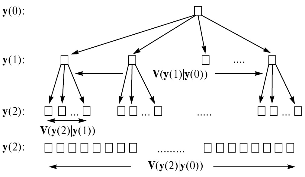 Рис. 2. Межгрупповая, внутригрупповые и полная матрицы ковариаций концентраций состояния популяций: □ – обозначение популяции; y(0) – состояние родоначальной популяции; y(1) – случайные состояния ее потомков, популяций первого поколения, разброс возможных состояний y(1) характеризуется матрицей ковариаций V(y(1)|y(0)), служащей межгрупповой матрицей ковариаций для популяций следующего поколения, где y(0) фиксировано; y(2) – случайные состояния популяций, потомков родоначальной популяции во втором поколении. Они образуют метапопуляцию, состоящую из групп с происхождением от отдельных популяций первого поколения и с внутригрупповыми матрицами ковариаций V(y(2)|y(1)). Здесь y(1) случайно варьирует между группами; следующая строка относится ко второму поколению без разбиения на группы его популяций, разброс которых характеризуется полной матрицей ковариаций Vs(y(2)). Стрелки, направленные сверху вниз, соединяют родительскую популяцию с популяцией потомков.