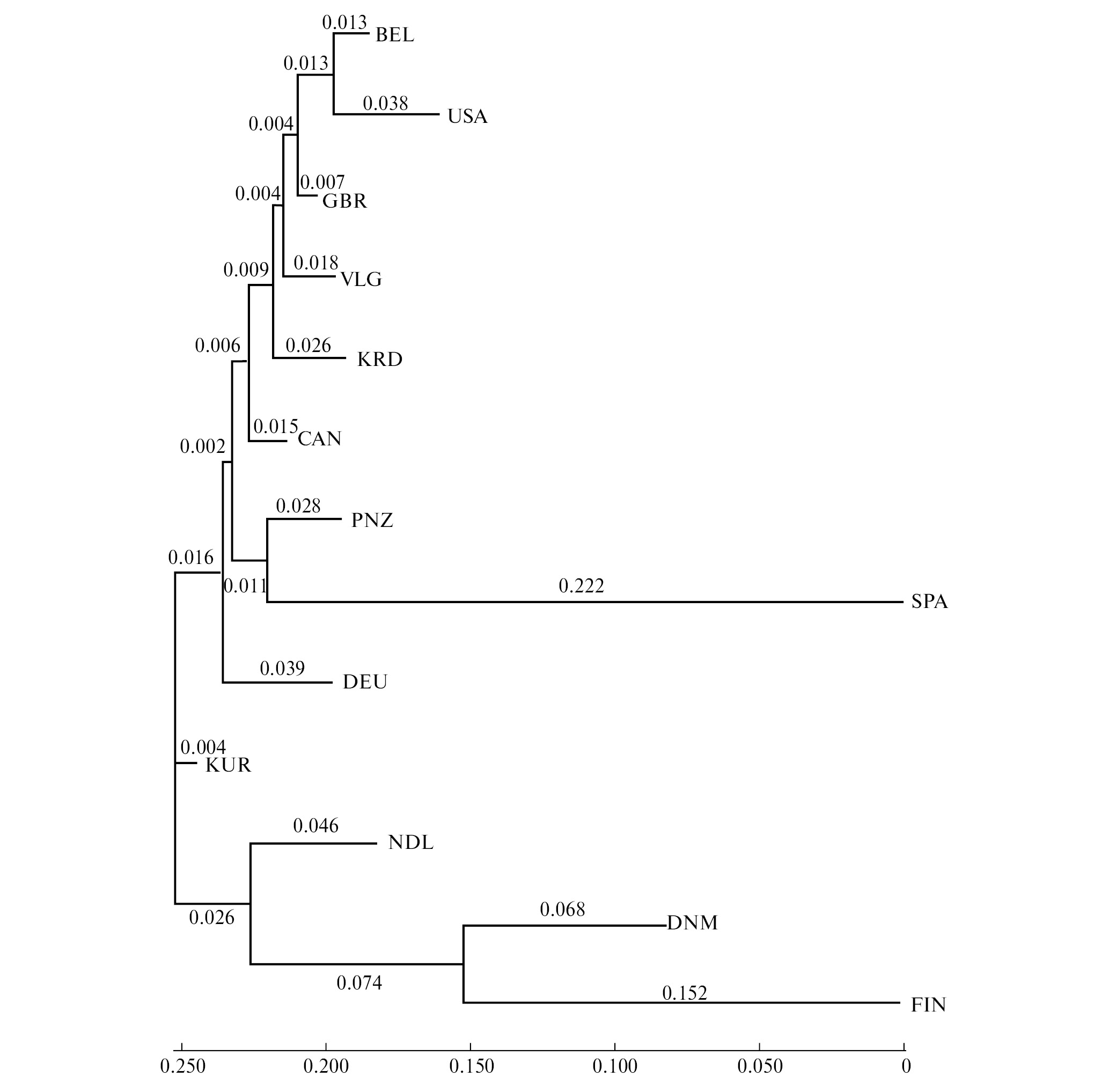 Для оценки генетической структуры породы с включением в анализ быков других стран использован метод оценки генетических отношений L (рис. 2) по принципиальным координатам PCoA, при этом между группами выявлены два отдельных кластера. В один кластер вошли животные VLG, KUR и PNZ вместе с быками DEU, в другой – группы BEL и KRD вместе с быками CAN, USA и GBR, отдельно оказались быки NDL, DNM и FIN. На основании анализа PCoA голштинский скот отечественной селекции подразделялся на две группы в зависимости от использования быков европейской или североамериканской селекции, имеющих наряду с общими признаками свои генетические особенности. Результаты филогенетического анализа по Нею [33, 34] подтвердили расположение популяций на основе показателей генетических расстояний, отражающих долю генетических вариаций (рис. 3). Величина рассчитанных генетических расстояний составляла от 0.002 до 0.222. Ранее выявляли генетические расстояния от 0.057 до 0.453 [31, 32]. Показано уменьшение генетических дистанций между анализируемыми породами за счет введения голштинской крови.