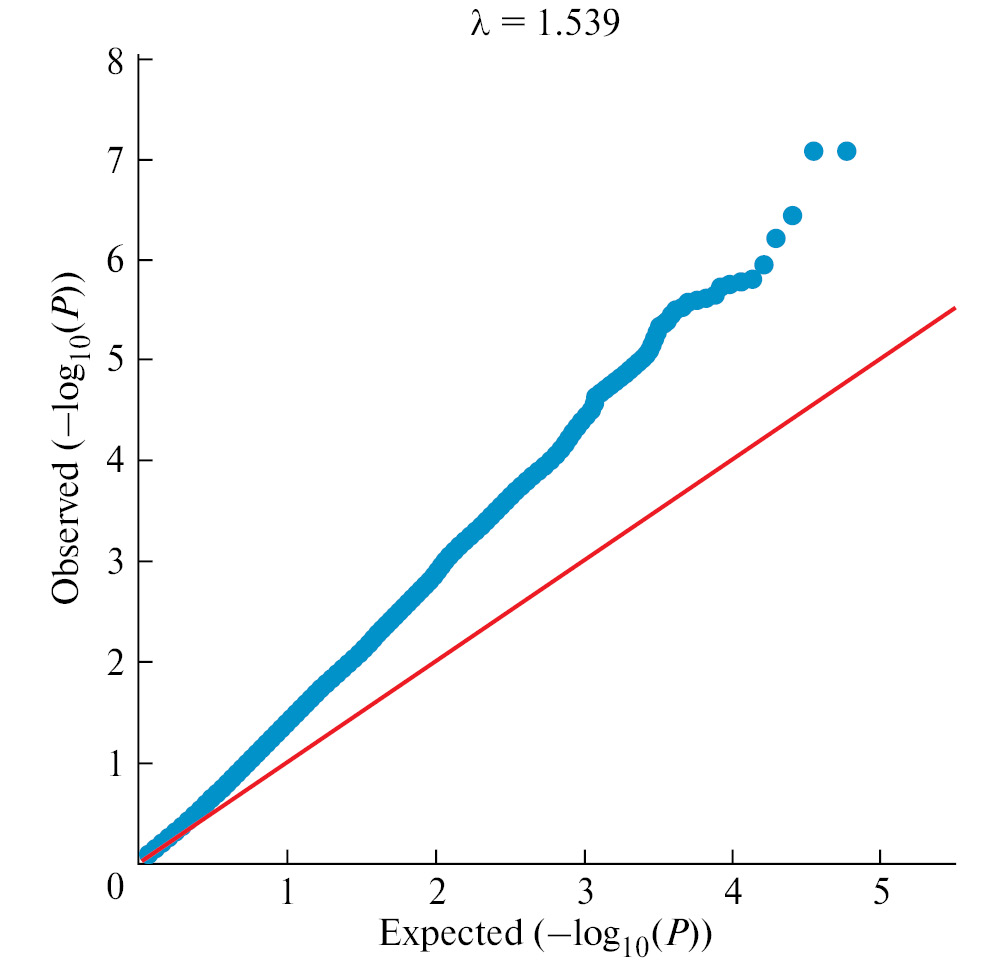 Ассоциативный поиск был выполнен с использованием Plink – набора инструментов для анализа ассоциаций всего генома, а именно расчета линейной регрессионной зависимости, а также коэффициентов детерминации. Значимость коэффициентов регрессии полиморфных сайтов оценивали с использованием теста Вальда. Потенциально значимыми считали сайты, p-значение которых было выше частного от деления уровня значимости (0.05) на количество полиморфных сайтов, а также p-значение теста Вальда у них было меньше 0.05. Оценку проведенного анализа ассоциаций проводили с использованием визуальной оценки квартиль-квартиль графиков, а также коэффициента λ (рис. 1). Графики квантиль-квантиль (QQ plot), построенные для оценки достоверности модели при уровне доверия р ≤ 0.005, демонстрируют значения λ = 1.539, что позволяет рассматривать доверительный уровень модели при р = 0.005 как приемлемый.