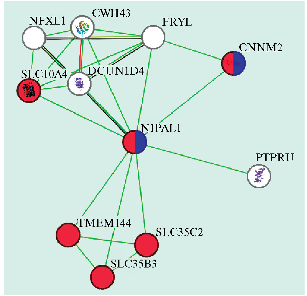 Из схемы, приведенной на рис. 3, можно выделить десять наиболее вероятных участников белок–белкового взаимодействия протеина NIPAL1 у крупного рогатого скота по данным string-db.org. Из них шесть (SLC104A, TMEM144, SLC35B3, SLC35C2, CNNM2 и NIPAL1) выполняют функцию трансмембранных транспортных белков (выделены красным). NIPAL1 совместно с CNNM2 являются трансмембранными переносчиками ионов магния (отмечены фиолетовым цветом). Для белков NFXL1, CWH43, FRYL, DCUN1D4, PTPRU совместная с NIPAL1 функция не установлена (окрашены в белый). Однако по NFXL1, CWH43, FRYL, DCUN1D4 имеется публикация об ассоциации данных белков с массой тела у кур [18]. Прогнозируемое взаимодействие наблюдается у белков CWH43 и DCUN1D4 (красная линия). Для белков NFXL1, FRYL, DCUN1D4 и NIPAL1 указана совместная экспрессия (черные соединительные линии). Также все рассмотренные на рис. 3 белки связаны светло-зеленой линией, что свидетельствует о встречаемости данных белков в публикациях.