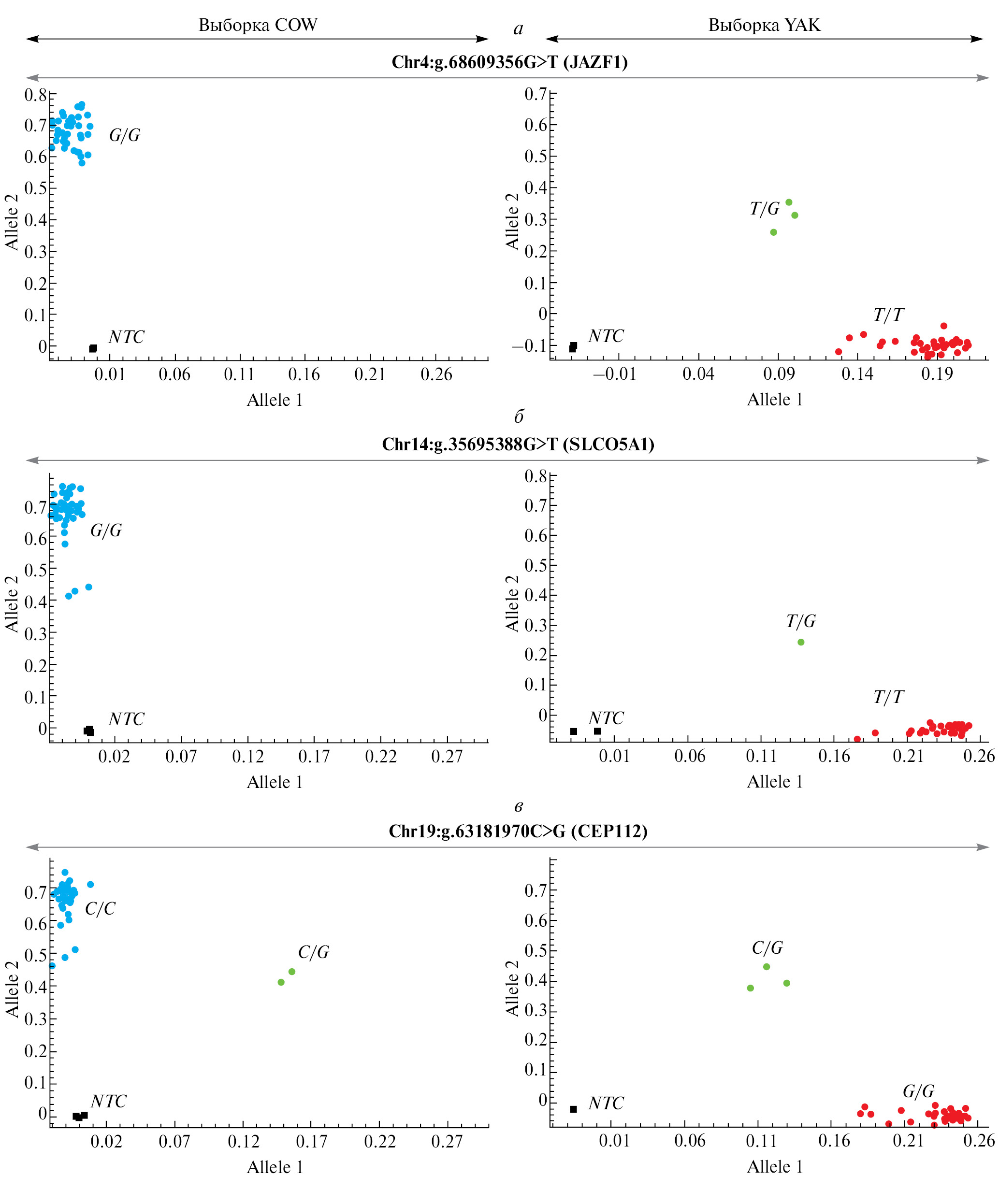 Рис. 1. График аллельной дискриминации результатов KASP для полиморфизмов: a – Сhr4:68609356G>T (JAZF1); б – Chr14:35695388G>T (SLCO5A1); в – Chr19:63181970C>G (CEP112).