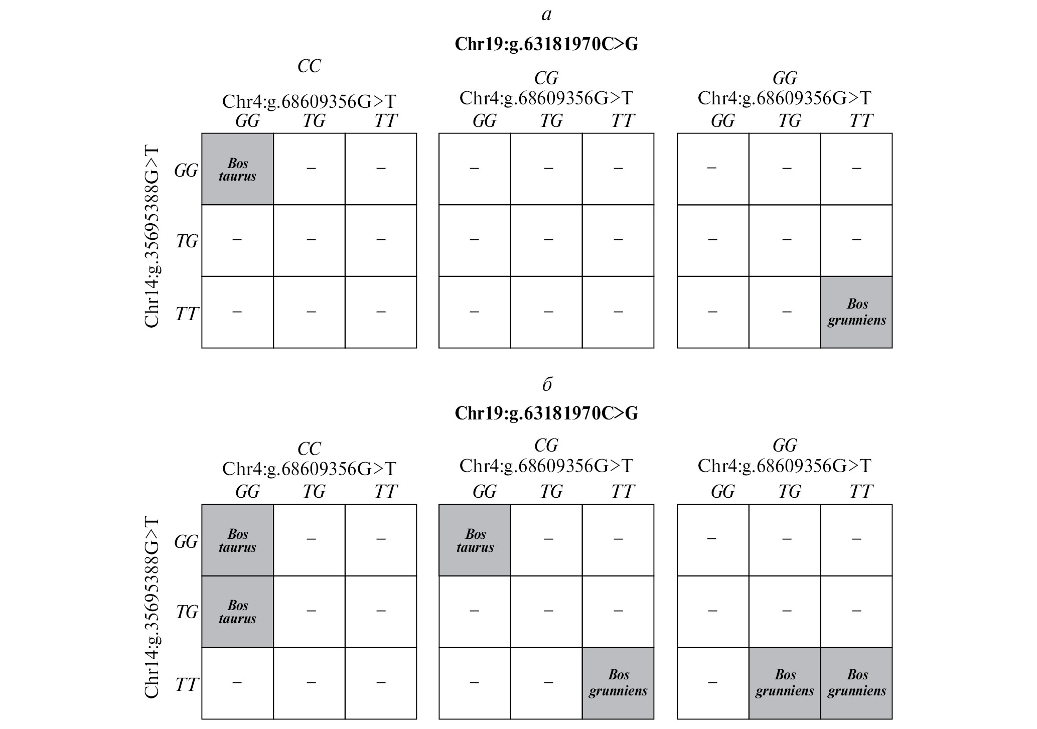 Таким образом, в настоящей работе мы показали, что сбалансированная точность дифференциации Bos taurus и Bos grunniens составила более 99%, что вполне достаточно для решения большинства задач популяционной генетики. Однако в 1.31% случаев (согласно модели, рис. 2, б) образцы домашнего яка и КРС не могут быть корректно дифференцированы c уровнем значимости p < 0,01. Это обусловлено относительно небольшим количеством особей с редкими генотипами, такими как CC (Chr19:63181970C>G) / TG (Сhr4:68609356G>T) / GG (Chr14:35695388G>T) – для КРС, или GG (Chr19:63181970C>G) / TT (Сhr4:68609356G>T) / TG (Chr14:35695388G>T) – для домашнего яка. Если же использовать уровень значимости p < 0.05 при MDR-анализе, то все 611 образцов дифференцируются корректно. Аналогичная ситуация показана для результатов дифференциации при использовании логистической регрессии.