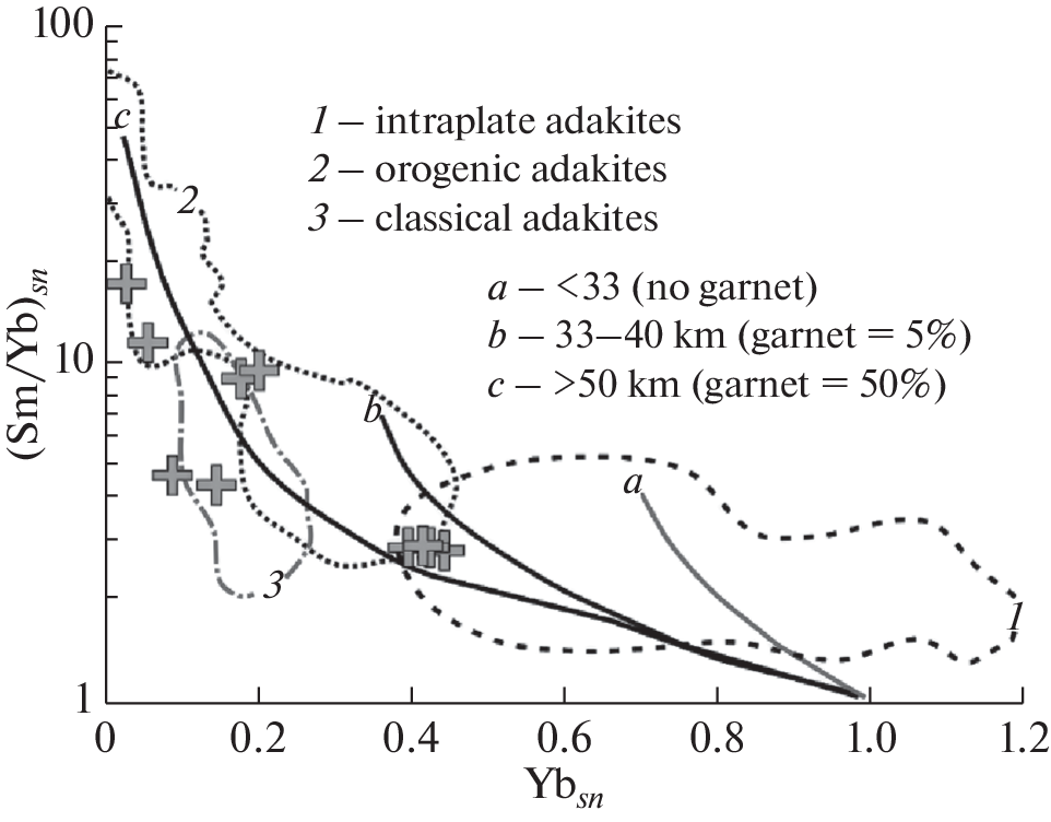 В данной статье впервые доказывается принадлежность позднемезозойских субщелочных гранитоидов северного обрамления восточного фланга Монголо-Охотского орогенного пояса к образованиям адакитовой серии. Этот вывод является результатом анализа оригинальных и опубликованных петрохимических, геохимических и изотопных (Sm-Nd, Rb-Sr) данных. Изученные гранитоиды характеризуются высокими значениями Sr/Y, Sr, Al2O3, LREE при аномально низких концентрациях HREE и отсутствии отрицательных европиевых аномалий. Полученные результаты и анализ геодинамической обстановки этапа их формирования позволили предположить: гранитоиды образовались на глубине более 45 км в результате плавления пород с содержанием граната 20–50%, что соответствует плавлению нижнекоровых докембрийских образований, которые широко развиты в южном обрамлении Сибирского кратона. Предполагается, что источником исходных расплавов являлось как мантийное, так и коровое вещество. Такой процесс может быть обусловлен субдукционной обстановкой, когда происходит плавление фронтальной составляющей океанической плиты или ее боковых частей в субдукционных “окнах”. В результате предложено выделить позднеюрско-раннемеловой чубачинский адакитовый комплекс (149–138 млн лет). Его формирование предшествовало начальному этапу становления надсубдукционного дифференцированного известково-щелочного магматизма (140–122 млн лет) в северном обрамлении восточного фланга Монголо-Охотского орогенного пояса.