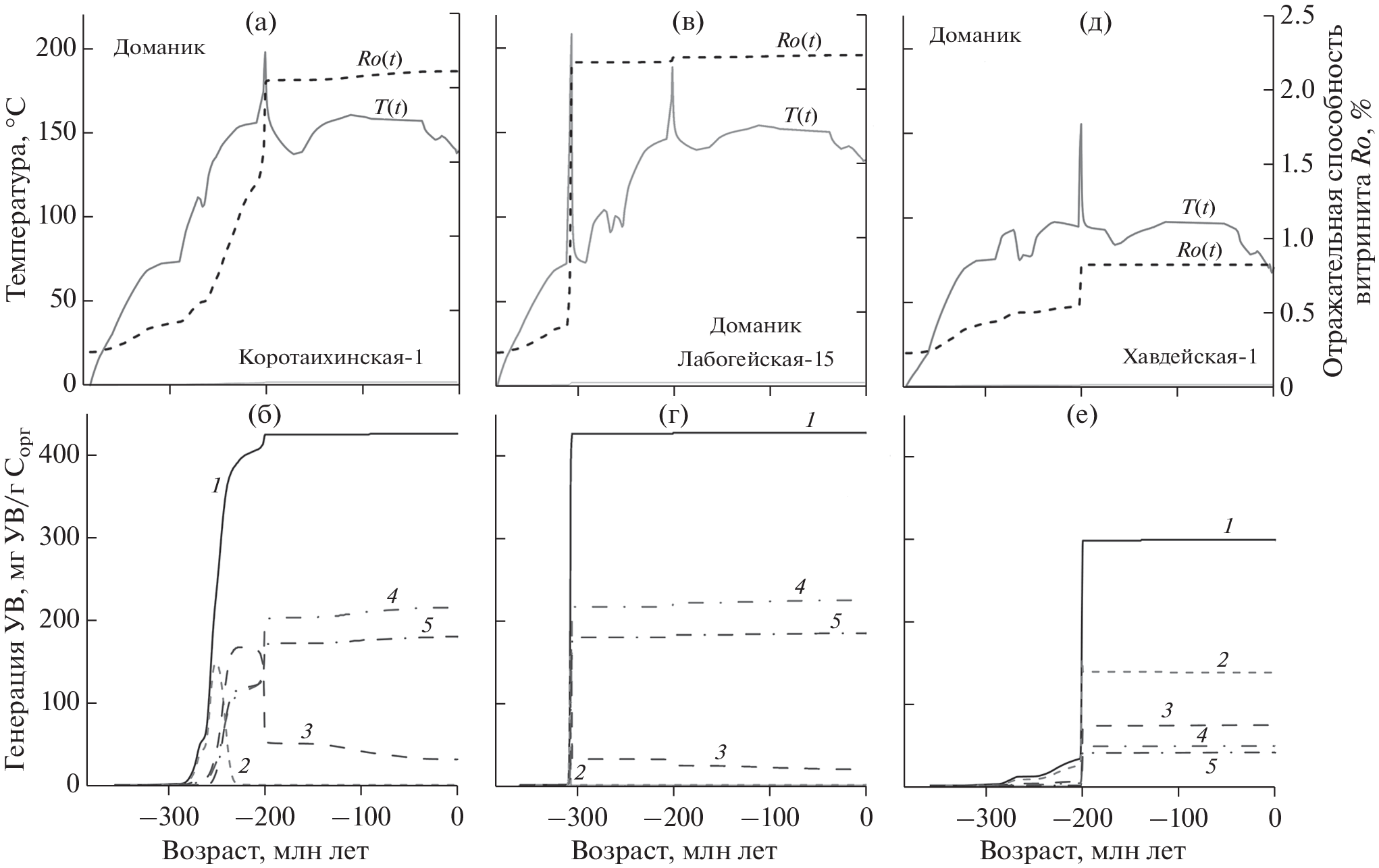 The 1-D burial and thermal history of the Korotaikha depression in the Timan–Pechora basin was numerically simulated for the sedimentary sequences of three wells: Korotaikhinskaya 1, Labogeyskaya 15, and Khavdeiskaya 1. This made it possible to numerically assess the conversion history of the hydrocarbon (HC) potential of source rocks in the southwestern flank of the Korotaikha depression in the northeastern Timan−Pechora basin. The modern modified kinetic spectrum of vitrinite maturation was used in calculations of the vitrinite reflectance to clarify the thermal history of the sedimentary cover of the study area. The occurrence of episodes of hydrothermal activity follows from comparison of the calculated and measured values of the vitrinite reflectance and explains the jumps in the maturity of organic matter at the boundaries of the unconformity of Quaternary and Triassic sediments, as well as the Permian and Carboniferous sediments. The simulations suggest a high conversion of the initial HC potential of the source rocks of the Silurian and Domanic horizons, Tournaisian, and Visean ages in the Korotaikhinskaya and Labogeiskaya areas and moderate generation in the Havdeyskaya area. The simulation shows that the high grades of the catagenesis (MC5 and higher) of the main source rocks and the significant role of secondary cracking of liquid HC fractions in the central part of the Korotaikha depression (wells Korotaikhinskaya 1 and Labogeyskaya 15) suggest that the possible HC accumulations should contain only gas. Accumulations in the southern part of the depression (Khavdeiskaya area), where secondary cracking was minimal and source rocks occur within the oil window, should contain both oil and gas (due to Permian rocks with terrigenous organic matter).