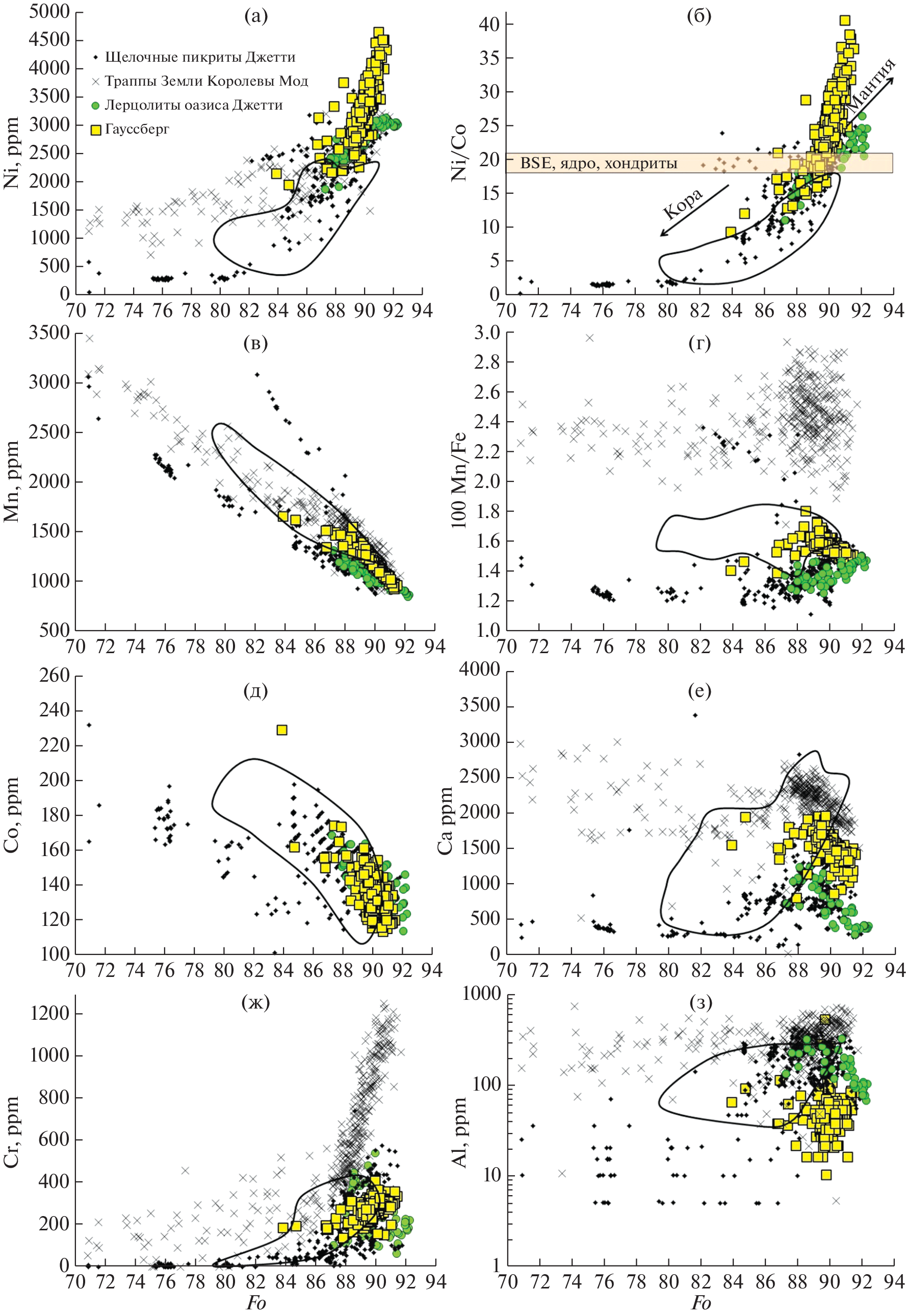 This paper presents numerous new data on the geochemical composition of olivine, clinopyroxene, and leucite phenocrysts, as well as spinel inclusions in olivine and quench glass from lamproites of the Gaussberg Volcano (East Antarctica). Most of the olivine phenocrysts in the Gaussberg lamproites are high Mg varieties (Fo 89–91) with elevated Ni contents (up to 4900 ppm) and high Ni/Co ratios. According to the data of about 320 analyzes of clinopyroxenes, two groups of phenocrysts belonging to the diopside group have been established. Group I consists mainly of high-Mg varieties (Mg#>80), while group II clinopyroxenes are less magnesian (Mg# 52–80). The main difference between the clinopyroxenes of the two groups is manifested in the increased contents of Al2O3, FeO and reduced TiO2, Cr2O3, and NiO in the compositions of group II compared to group I, as well as different contents of trace elements, which may reflect their crystallization from different types of primary melts. According to the study of about 550 grains of leucite phenocrysts in Gaussberg lamproites, it was shown that they correspond to the ideal stoichiometry of leucite K[AlSi2O6] and are enriched in Na2O (0.05–0.35 wt %), but depleted in K2O (19.9–20.9 wt %) compared to with leucites from lamproites of other provinces. The BaO content reaches 0.3 wt %. %, SrO –0.04 wt. %. The iron content in most leucite phenocrysts varies within 0.7–1.2 wt % Fe2O3, with individual grains with low Fe2O3 contents (<0.5 wt %). In microlites of leucite in the groundmass and rims of phenocrysts, the iron content can reach 2.4 wt % Fe2O3, which may indicate more oxidized conditions at the time of lava eruption.