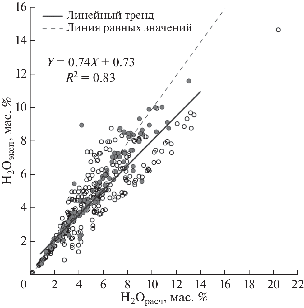 The Moore equation, converted to exponential form, is recalibrated on an extended experimental sample. As a result, new coefficients for this equation are obtained: a = 918; bAl2O3 = – 0.712; bFeO = – 0.749; bNa2O = 0.806; c = 1.087; d = -11.45. The Moore equation with new coefficients makes it possible, with an error not exceeding ±1 - ±2 relative percent, to predict the saturated water content in silicate melts in the range: melt compositions from basalts to rhyolites; pressure from atmospheric to 15 kbar; temperatures from 550 to 1300 °C.