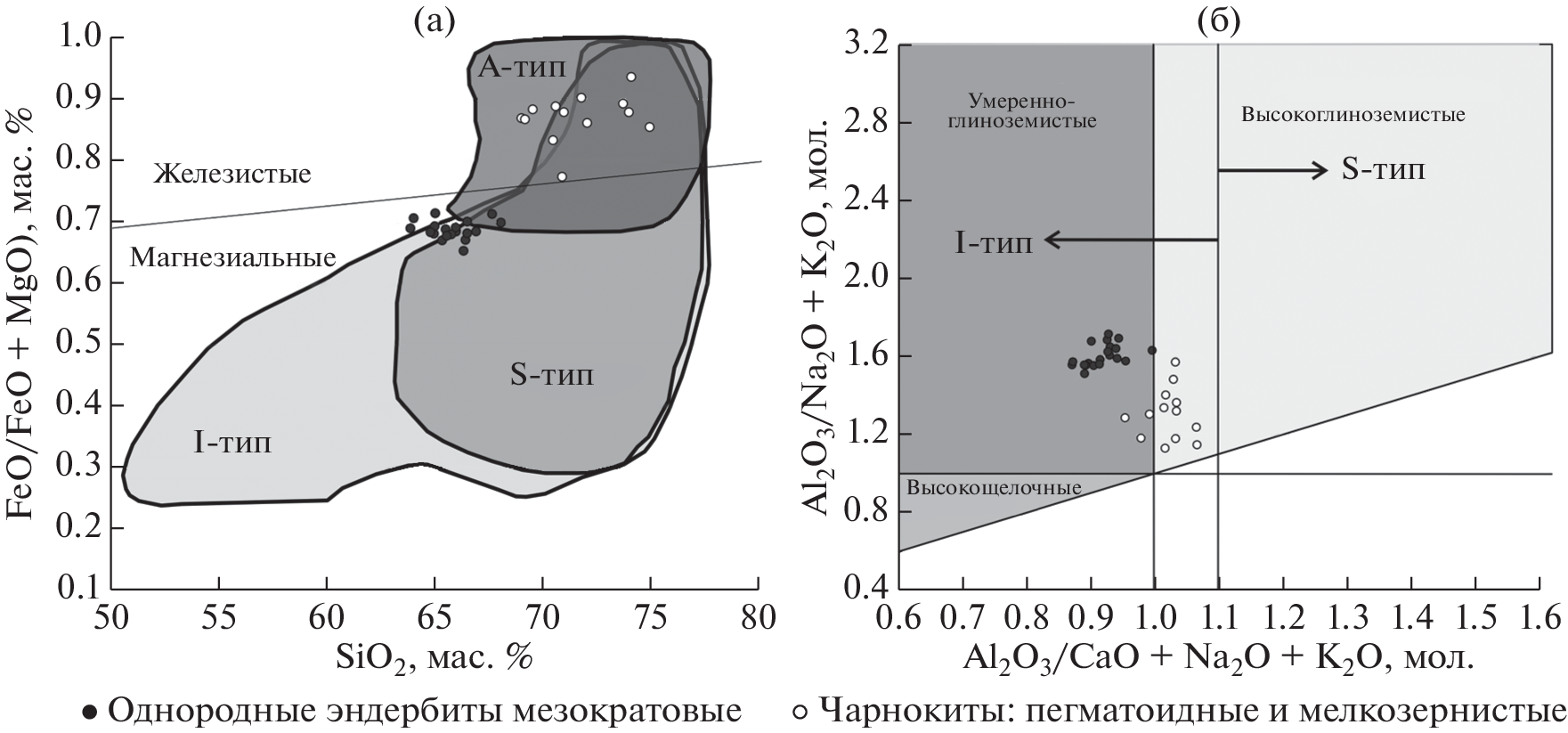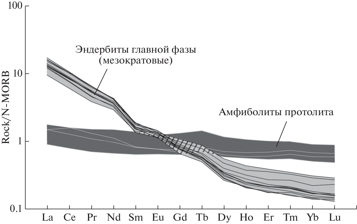 The paper presents authors’ original detailed data on rocks of the Archean Pon’goma-Navolok charnockite−enderbite complex in northern Karelia. The rocks practically have not been modified and are preserved within a rigid block among Paleoproterozoic zones of ductile deformations and metamorphism. The geochemistry of the rocks and their isotope−geochemical features indicate that the protolith from which the enderbite melts of the main phase of the massif were derived may have been amphibolites. The enderbite melts were derived from these amphibolites under the effect of K2O-, Na2O-, and SiO2-bearing fluids; and the enderbites were subsequently charnockitized with the involvement of fluids enriched in K2O and SiO2. Physicochemical modeling indicates that the enderbite melt was derived from the amphibolite protolith at a depth of about 45 km (P = 14.8 kbar, T = 1030−1080°C) under the effect of saline H2O−CO2 fluid. Comparison of the P−T parameters of the granulite-facies metamorphism of the metabasites and the parameters under which the enderbite melts were derived indicates that Archean granulite-facies metamorphism in the Belomorian belt in northern Karelia was of contact but not regional nature and was induced by the high-temperature field of an emplaced enderbite massif. The orthogneisses hosting the Pan’goma-Navolok massif inherit geochemical features of the unsheared, ungneissose, and unmetamorphosed enderbites. This means that enderbites analogous to those of the Pan’goma-Navolok massif may have served as the protolith of some of the orthogneisses, and that enderbites may have been spread more widely in the Archean than the currently preserved single enderbite massifs.