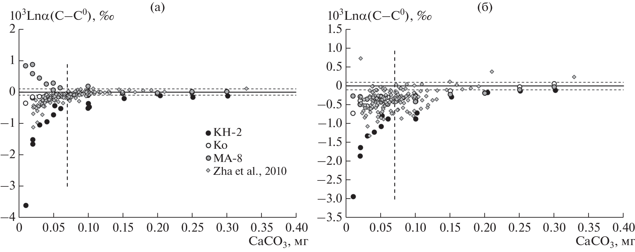 An experimental study of the main factors affecting the accuracy of oxygen and carbon isotopic analysis in carbonates dispersed in silicate matrix is carried out. Artificial 1, 2, 5, and 10% mixtures of quartz with carbonates with different isotopic parameters (KH-2, Ko, MCA-8) were analyzed by continuous flow isotope ratio mass spectrometry (CF IRMS). It is established that, in addition to the influence of the instrumental nonlinearity, the results are affected by two factors: trace amounts of CO2, constantly present in the system (the blank effect) and the presence of chemically neutral silicate particles (the matrix effect). The blank effect depends on the isotopic parameters of the sample and has very little influence on the estimated carbonate content in the rock. The matrix effect, on the contrary, strongly affects the estimated carbonate content, and produces the isotopic shift towards underestimated contents of heavy 13C and 18O isotopes. It is shown that this effect is related to the processes occurring near the CO2–acid–quartz interface, which are accompanied by kinetic fractionation of carbon and oxygen isotopes. Both effects are dependent on the amount of silicate matrix in the system and most clearly manifested during analysis of carbonate-poor rocks. When the carbonate content in the rock is about 1–2%, deviations from the true δ13C and δ18O values can reach the first ppm, while carbonate content obtained by chromatographic peak calibration can be underestimated by 20–40%.