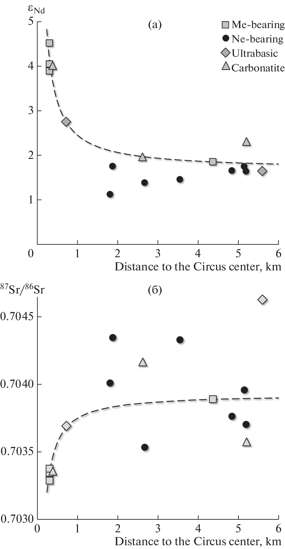 This study focuses on the igneous rocks composing the Odikhincha massif. The massif is typical ring alkaline–ultrabasic massif with carbonatites, second largest in the Maimecha-Kotui province. The Sr-Nd isotopic values of the traps of the Arydzhang Formation and the host dolomites were also determined for comparison. The Rb–Sr isotope system of phlogopite and calcite from the Od-16-19 carbonatite of the Odikhincha massif is disturbed; the obtained age on the mineral isochrone (245 ± 3 Ma) is close to the time of formation of the Siberian traps and rocks of the ultrabasic–alkaline Maimecha-Kotui complex, but the large scatter of analytical points (MSWD = 22) does not allow this date to be considered as reliable. The disturbance of the isotope system is probably related to the fact that the strontium isotope ratio in the fluid was not constant during autometasomatic phlogopitization of carbonatite. The U–Pb isotopic system of titanite and perovskite from the same carbonatite sample Od-16-19 also appeared to be disturbed, since data points formed discordia. The U–Pb age obtained for titanite and perovskite are 244 ± 5 Ma (MSWD = 1.8) and 247 ± 18 Ma (MSWD = 4), respectively. Apparently, the age values provided by the two isotopic systems (245 ± 3 Ma by Rb–Sr and 247 ± 18 and 244 ± 5 Ma by U–Pb) are consistent with each other and reflect the time of metasomatic processes, i.e., phlogopitization and iolitization. Rb–Sr and Sm–Nd isotope data for ultrabasic–alkaline intrusive rocks with carbonatites of the Odikhincha massif and volcanics of the Arydzhang Formation indicate an enriched, relative to the composition of the convecting mantle, isotopically heterogeneous source of their parent melts. This source could be a combination of ultrabasic mantle rocks and rocks of basic composition (basites). The latter played the role of an enriched component. No signs of contamination of the melts with the host sedimentary rocks in situ were found, however, variations of Sr and Nd isotopic ratios in the rocks of the Odikhincha massif may indicate that during the introduction of deep magmas their interaction and substance exchange with the surrounding rocks of the lithosphere continued up to complete solidification of the melts, as indicated by the nature of local isotopic heterogeneity within the Odikhincha intrusion.
