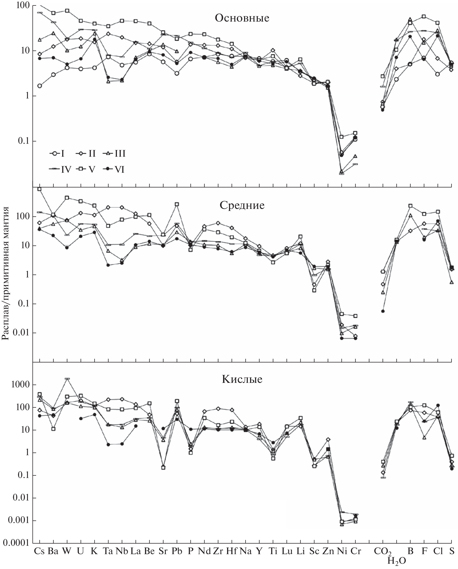 Data from our original database, which includes more than 2 600 000 analyses for 75 elements of mineral-hosted melt inclusions and quench glasses in volcanic rocks, are generalized to calculate the mean concentrations of major, volatile, ore, and trace elements in magmatic melts from the following dominant geodynamic environments: (I) spreading zones of oceanic plates (mid-oceanic ridges), (II) environments affected by mantle plumes in oceanic plates (oceanic islands and lava plateaus), (III, IV) environments related to subduction processes (III is zones of arc magmatism on the oceanic crust, and IV is zones of magmatism in active continental margins in which magma-generating processes involve the continental crust), (V) environments of continental rifts and areas with continental hotspots, and (VI) environments of backarc spreading. A histogram of SiO2 distribution in natural magmatic melts shows a bimodal distribution: one of the maxima falls onto SiO2 concentrations of 50–52 wt % and the other onto 72–76 wt %. The most widely spread melts contain 62–66 wt % SiO2. Mean temperatures and pressures are calculated for each of the environments. The normalized multielemental patterns presented for environments I through VI show the ratios of the mean concentrations of elements in magmatic melts of mafic, intermediate, and felsic composition to the concentrations in the primitive mantle. Mean ratios of incompatible, trace, and volatile components (H2O/Ce, K2O/Cl, Nb/U, Ba/Rb, Ce/Pb, etc.) are evaluated for the melts of each of the environments. The variations in these ratios are calculated, and it is demonstrated that the ratios of incompatible elements are mostly statistically significantly different in the different environments. The differences are particularly significant between the ratios of the most differently incompatible elements (e.g., Nb/Yb) and some ratios involving volatile components (e.g., K2O/H2O).