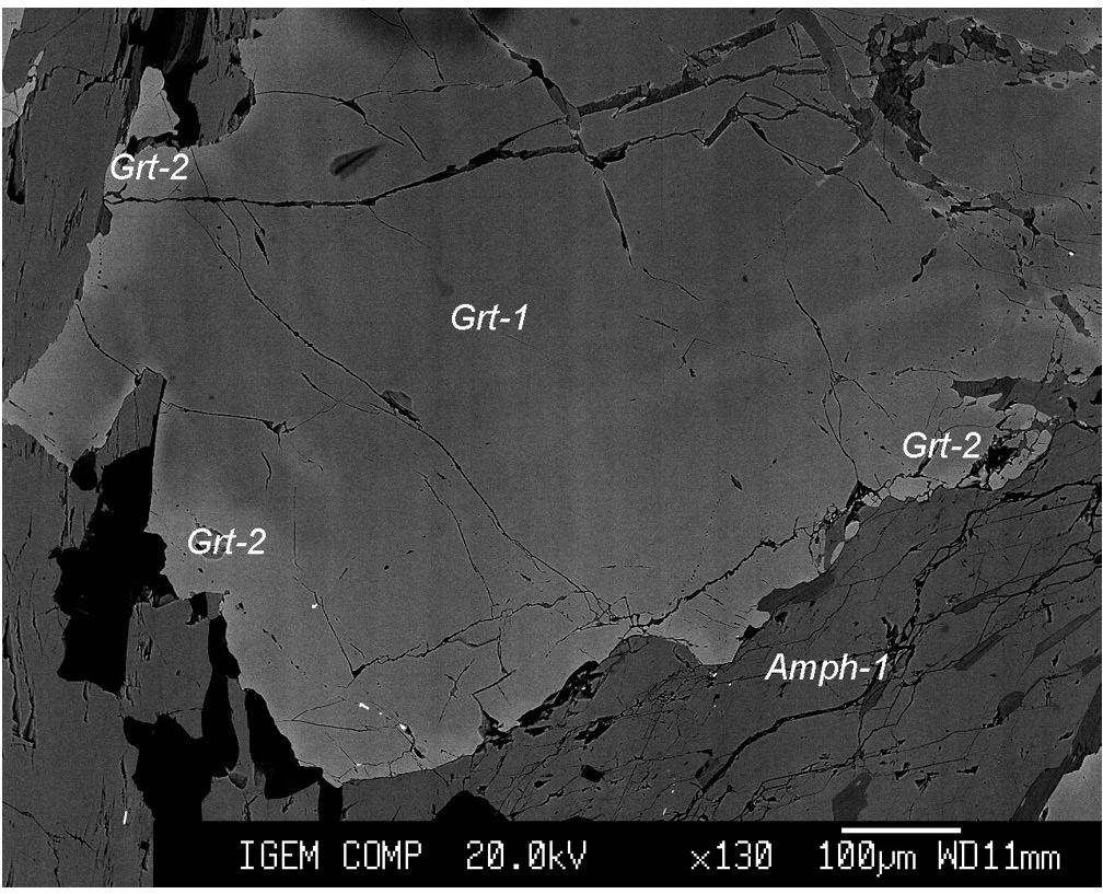 Рис. 3. Зональный гранат, гранат-цоизит-кварц-амфиболовых бластолитов. В центральной части зерен сохранился высокомагнезиальный гранат-1 эклогитовой ассоциации; по краям на контакте с амфиболом-1 в гранате формируется железистая зона граната-2.