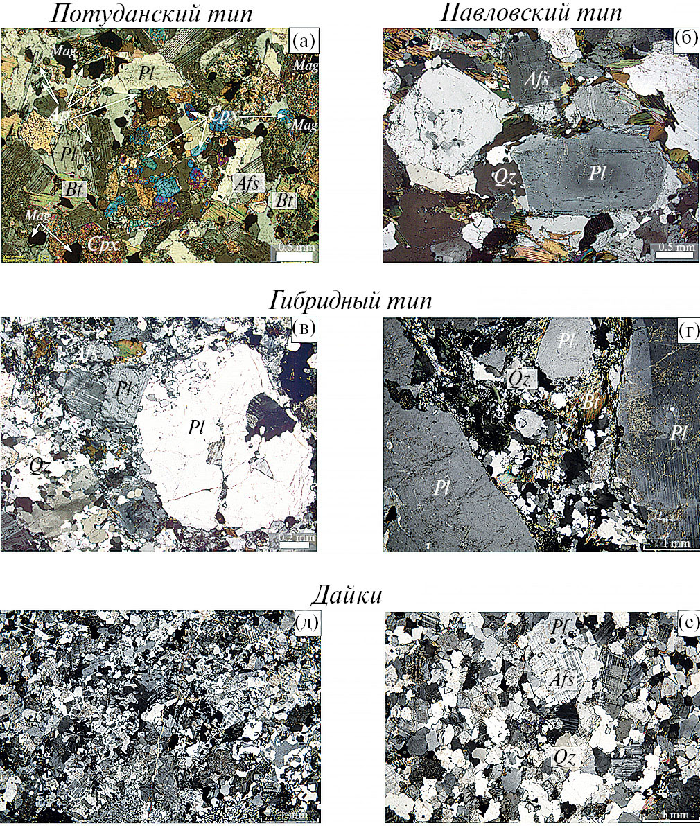 Рис. 3. Микрофотографии прозрачно-полированных шлифов гранитоидов Хохольско-Репьевского батолита: (а) — потуданский тип; (б) — павловский тип; (в) и (г) — гибридный тип; (д) и (е) — дайки. Pl–плагиоклаз, Qz–кварц, Afs–щелочной полевой шпат, Cpx–клинопироксен, Bt–биотит, Mag–магнетит, аббревиатуры минералов приведены по (Whitney, Evans, 2010).