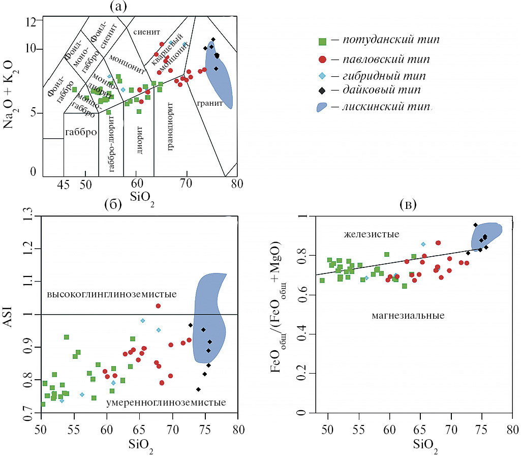Одной из причин плавления коры на разных уровнях рассматривается участие базальтовых магм (Huppert, Sparks, 1988; Annen et al., 2008; Gao, 2016). На возможный вклад основных расплавов в образование изученных гранитоидов указывает присутствие среди пород потуданского типа монцогаббро. Под воздействием тепла горячих базитовых интрузий в центральной части Донского террейна, могли плавиться породы архейского фундамента Курского блока, который развит неравномерно и представлен здесь сильно переработанными ТТГ-гнейсами Россошанского блока (Savko et al., 2014; Минц и др., 2017). Здесь же, в центральной части Донского террейна, к югу от плутона Потудань находится лискинский гранит-лейкогранитный комплекс. Лискинские лейкограниты демонстрируют типичные признаки А-гранитов: высокие содержания SiO2, Na2O+K2O, фтора и значения FeO*/MgO, TiO2/MgO, низкие концентрации СаО, MgO, высокие температуры ликвидуса (870±18 °C) и характерный набор акцессорных минералов, включающий ксенотим, тантало-ниобаты, флюорит (Терентьев, 2016). Возраст формирования лискинских лейкогранитов 2064 ±14 млн лет (Терентьев, 2016), что практически синхронно с потуданским комплексом 2056–2068 млн лет.