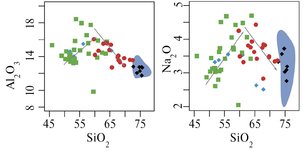SiO2 | 46.95 | 50.82 | 53.62 | 53.86 | 53.98 | 54.31 | 56.05 | 58.47 | 61.51 | 61.23 | 62.91 | 64.07 | 64.34 |