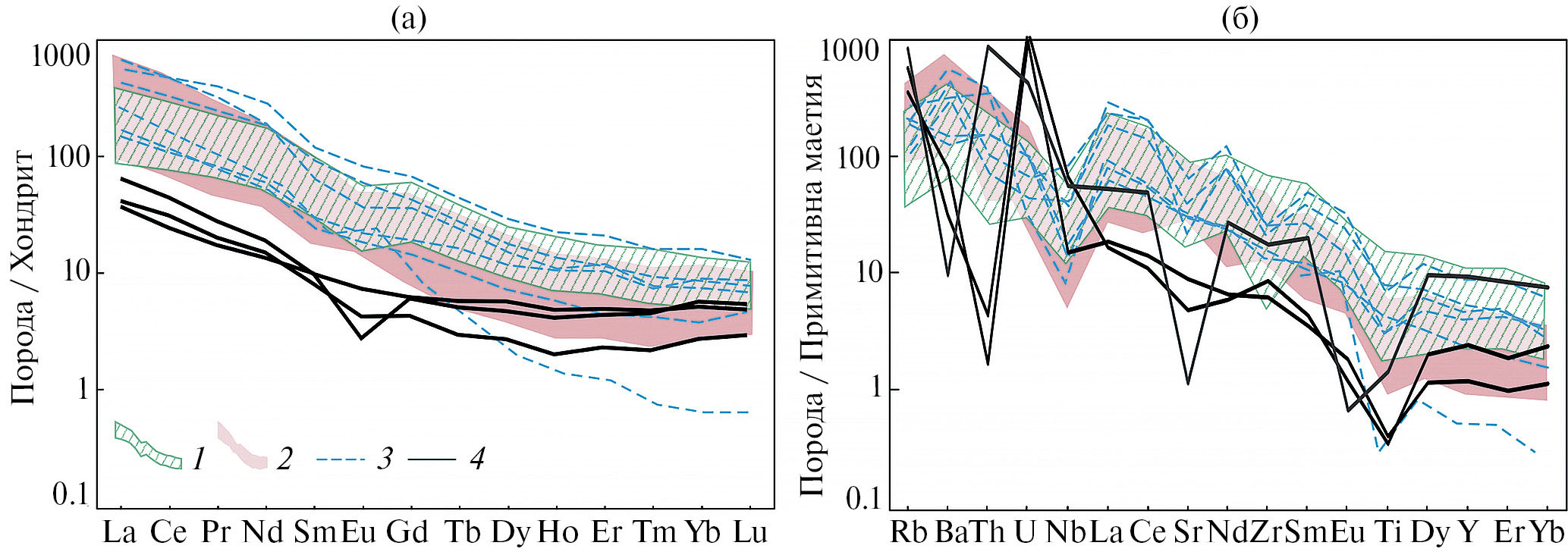 Согласно имеющимся представлениям (Guo et al., 2006; Pilet et al., 2008, 2010; Ou et al., 2019) обогащенный источник щелочных и, в том числе, высококалиевых расплавов в метасоматизированной литосферной мантии представляет собой серию амфибол- и флогопит- содержащих жил, сформировавшихся в результате метасоматического взаимодействия мантийных перидотитов и продуктов плавления терригенных осадков в надсубдукционной обстановке при участии флюидов. Геохимическим признаком участия такого источника в формировании расплавов является повышенное содержание таких флюидомобильных элементов, как K, Rb, Ba, Pb, Sr, относительно других несовместимых элементов, а также повышенное отношение 87Sr/86Sr в породах, образованных при участии такого источника. Наиболее очевидно отражают участие метасоматизированной литосферной мантии изотопно-геохимические особенности пород потуданского типа.