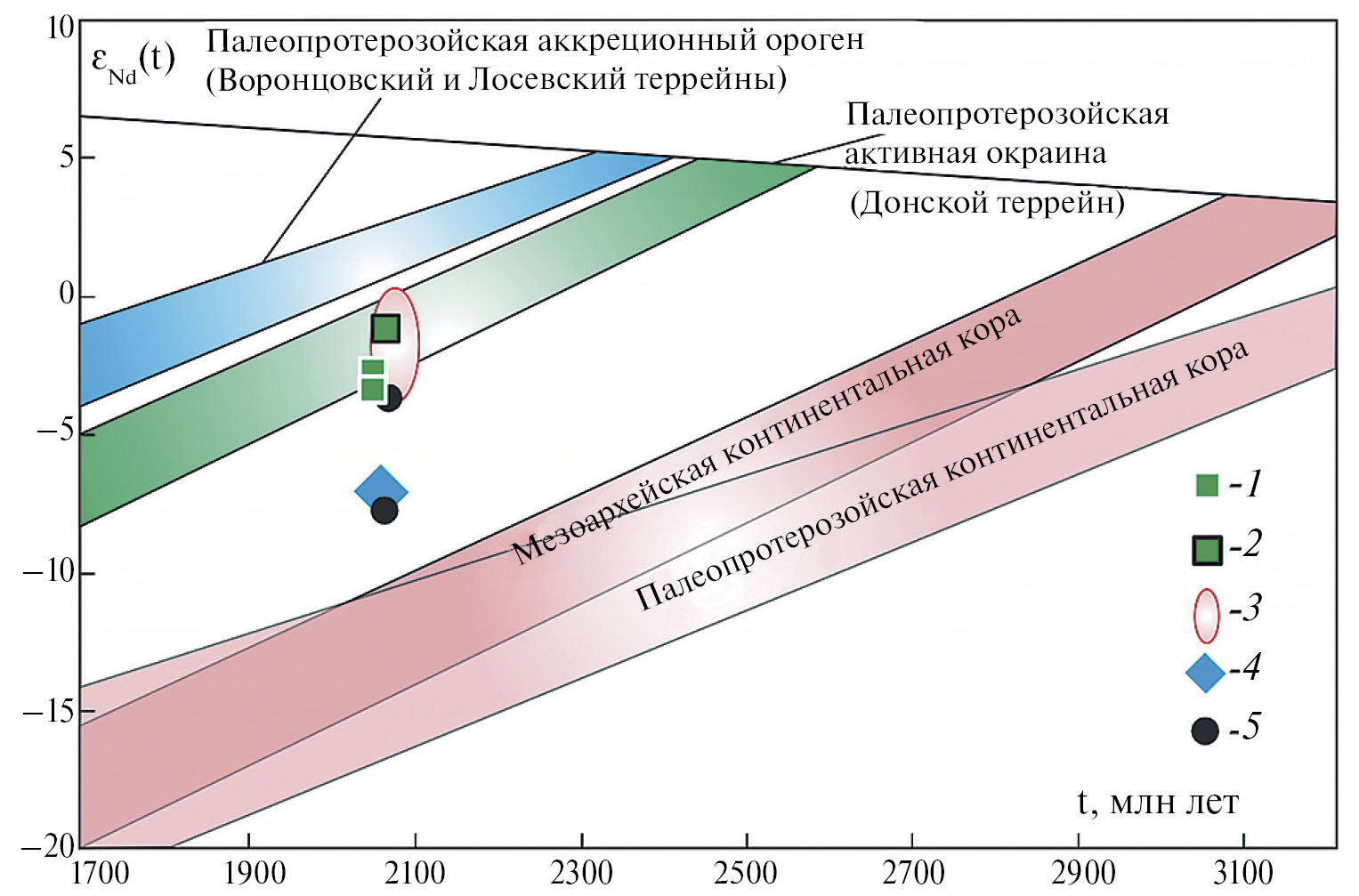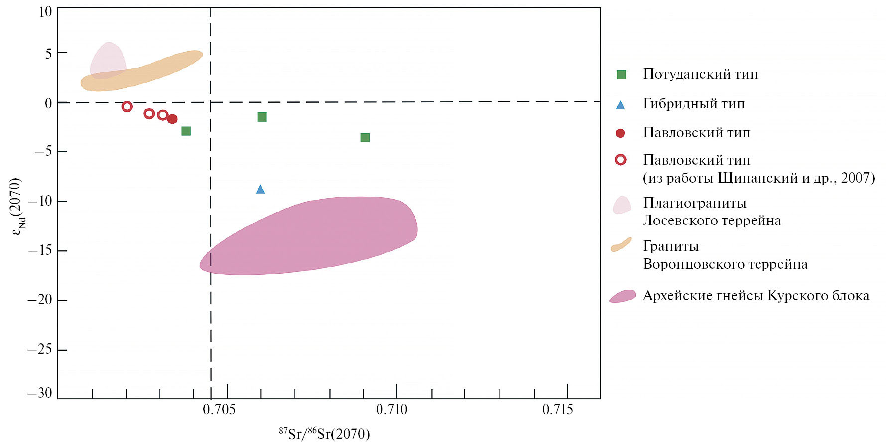 Согласно Nd-Sr изотопным данным (рис. 10) в формировании пород Хохольско-Репьевского батолита принимали участие как минимум три компонента: 1) нижняя кора, преимущественно мафитового состава и/или обогащенная мантия, метасоматизированная в протерозое, метки которых отражаются в составе павловских гранитоидов; 2) обогащенный мантийный источник, вероятно представленный субконтинентальной литосферной мантией, возможно, метасоматизированной в архее, характерный для монцонитоидов потуданского типа; 3) средняя архейская кора, состоящая преимущественно из ТТГ-гнейсов и метаосадков, подвергшаяся плавлению.