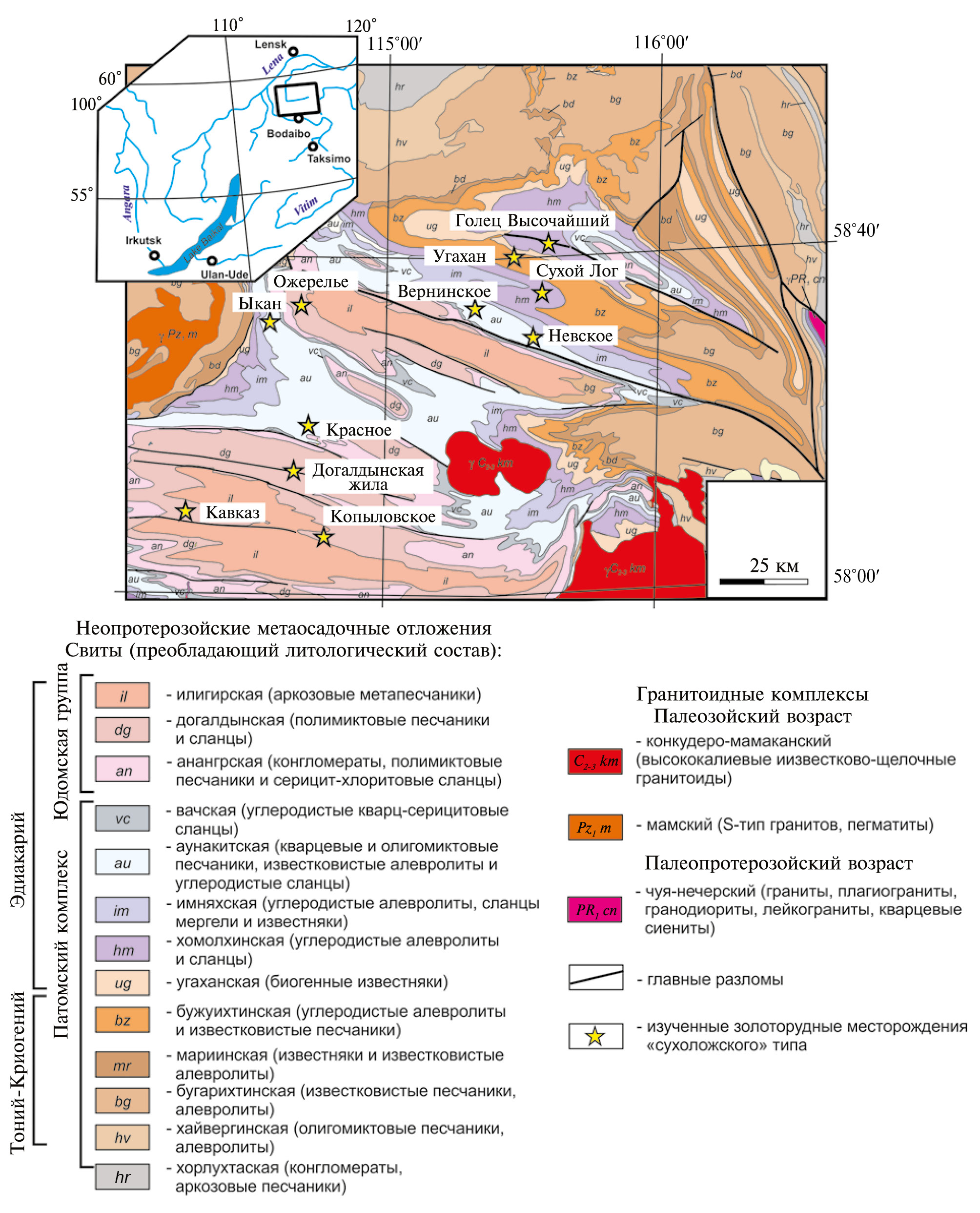 Рис. 6. Геологическая схема Бодайбинского рудного района (Байкало-Патомский пояс) с указанием положения изученных месторождений «сухоложского» типа (по данным Tarasova et al., 2020) с изменениями.