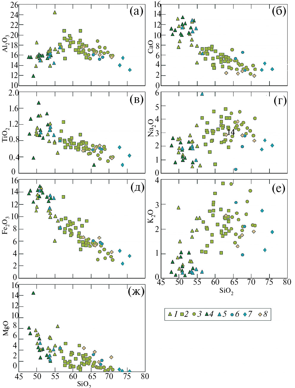 Рис. 4. Вариационные диаграммы (SiO2 — петрогенные элементы, мас.%) для пород нижней, средней и верхней толщ. 1–8 — условные знаки те же, что и на рис. 3.