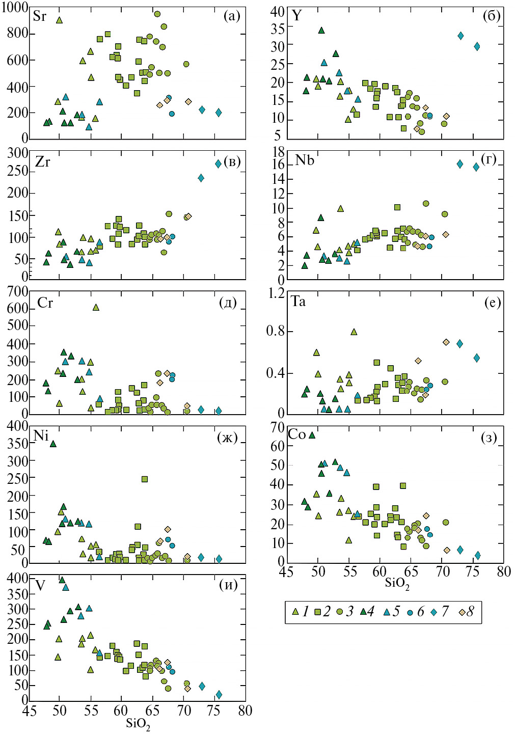 Рис. 5. Вариационные диаграммы (SiO2, мас.% — редкие элементы, мкг/г) для пород нижней, средней и верхней толщ. 1–8 — условные знаки те же, что и на рис. 3.