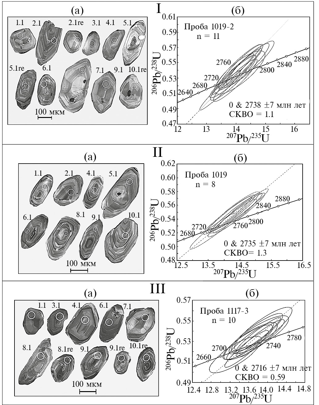 U-Pb возраст оценен в цирконах из 5 проб, в этих же пробах определен изотопный состав Sm и Nd. Пробы отбирались из наименее переработанных пород, а затем отбраковывались с помощью шлифов, микрозондового анализа и аналитических данных. Выделение акцессорных цирконов проводилось по стандартной методике с использованием тяжелых жидкостей. Изотопный анализ U и Pb в цирконах выполнен на ионном микрозонде SHRIMP-II в Центре изотопных исследований ФГБУ «ВСЕГЕИ» (Санк-Петербург). Данные обрабатывались согласно процедуре, описанной в (Williams, 1998) с использованием программ SQUID (Ludwig, 2000) и Isoplot/Ex (Ludwig, 2001). Pb/U отношения нормализовались на 0.0665 для 206Pb/238U в стандартном цирконе ТЕМОRА, соответствующем возрасту 416.7 ± 1.30 млн лет (2σ) (Blaсk et al., 2003).
