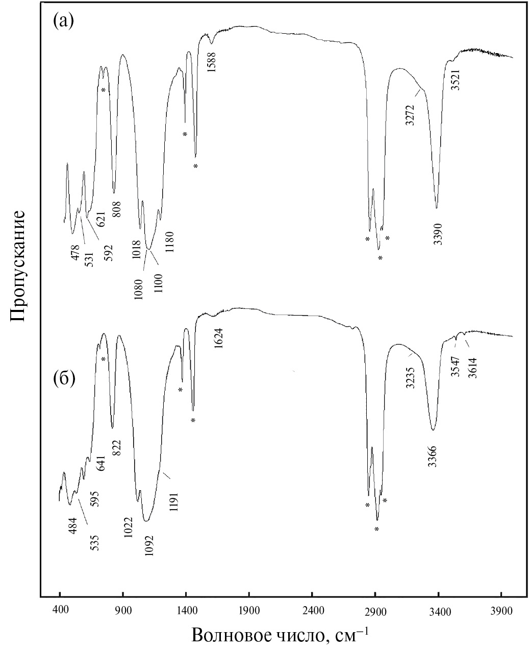 Рис. 1. Спектры инфракрасного поглощения: (а) — монтебразита (обр. I) и (б) — амблигонита (обр. II). * — полосы поглощения вазелинового масла.