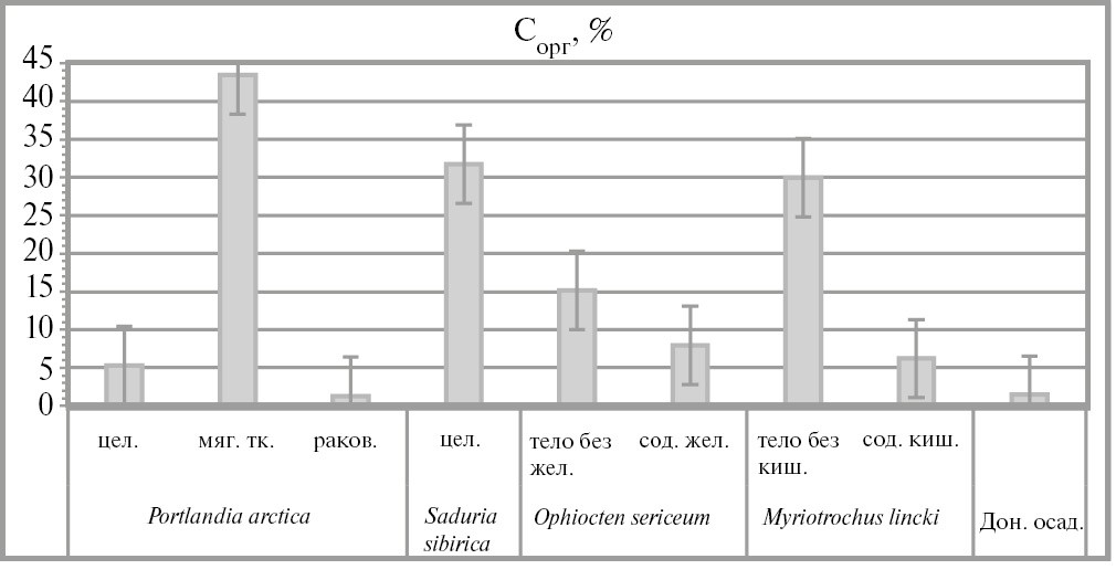 В отличие от микроэлементов, содержание Сорг в различных компонентах тел детритофагов и грунтоедов многократно выше (5–44.36 %, табл. 4), чем во вмещающих донных осадках (1.43 % в среднем). Наиболее высокое содержание Сорг выявлено в мягких тканях двустворок, целых телах ракообразных и телах без кишечника голотурий – от 29.92 % до 44.36 %. В содержимом желудочно-кишечного тракта офиур и голотурий также обнаружены повышенное (в 4–6 раз) содержание Сорг относительно осадков (рис. 8).