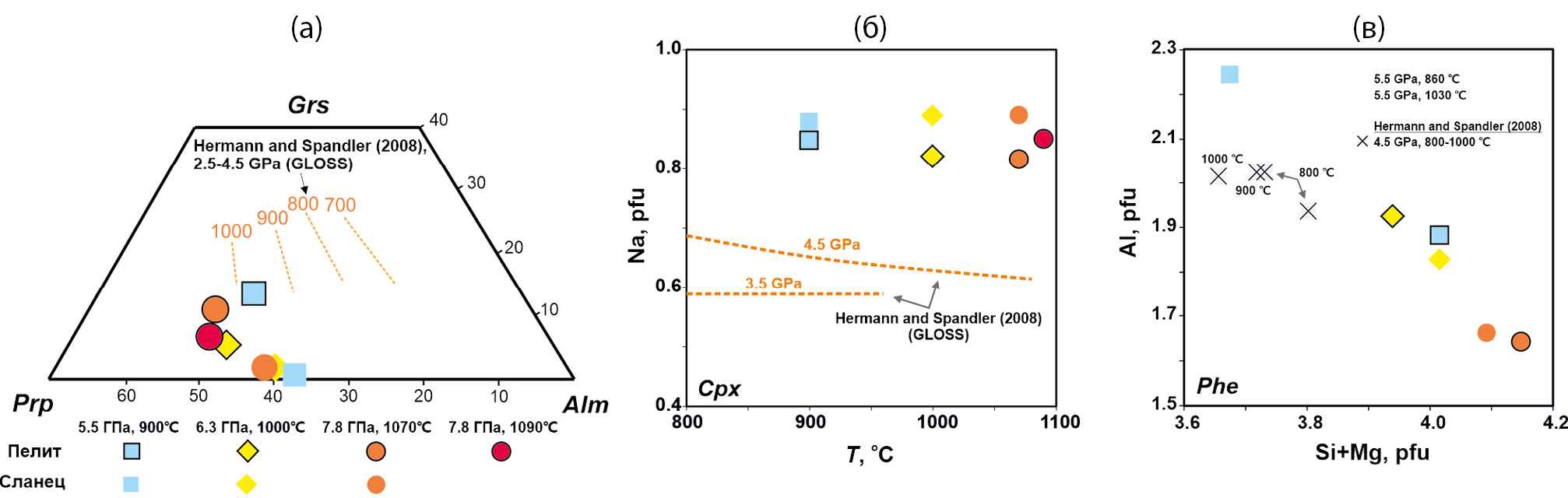 Рис. 3. Представительные составы граната (а), клинопироксена (б) и фенгита (в) из образов с пелитом и сланцем после экспериментов. На рисунках оранжевым пунктиром показана специфика изменения состава граната с ростом температуры (а) и клинопироксена с ростом давления (б) в системе GLOSS по данным (Hermann, Spandler, 2008)
