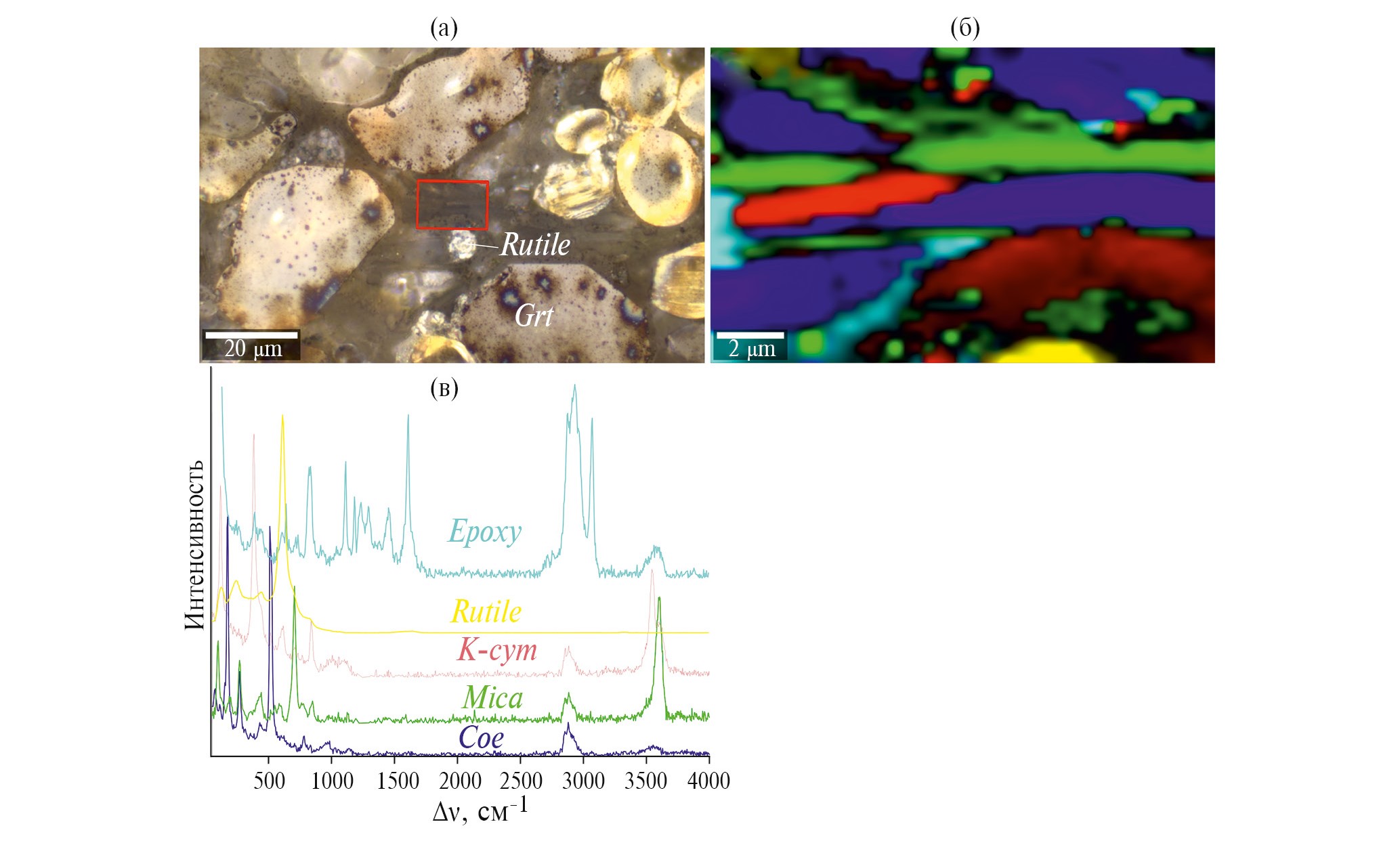 Рис. 5. Фотография фаз, синтезированных в опыте 2077_2_3 (а), КР-карта (б) и индивидуальные КР-спектры (в), диагностированных минералов. Цвета на КР-карте и цвета индивидуальных спектрах идентичны. Epoxy = эпоксидная смола, Rutile = рутил, K-cym = К-кимрит, Mica = слюда, Coe = коэсит