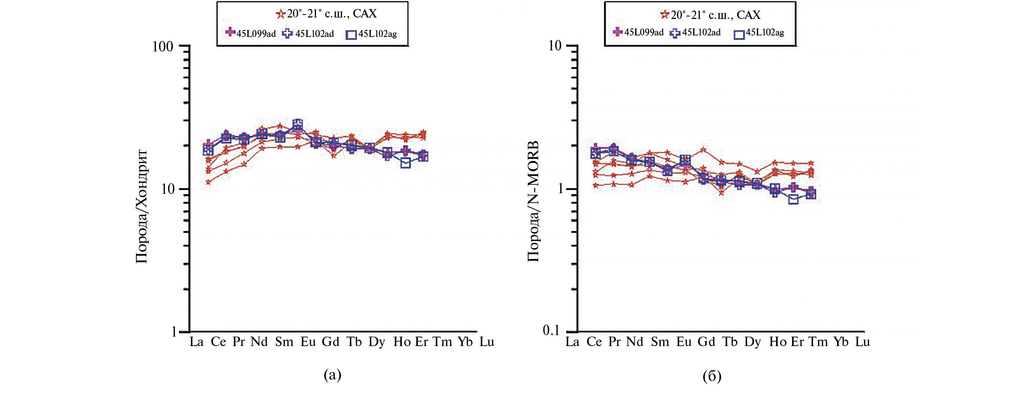 Обращает на себя внимание то обстоятельство, что во всех координатах, использованных на рис. 5 (как и на рис. 4), состав изученных в настоящей работе закалочных стекол занимает промежуточное положение между полями состава типичных N-MORB (САХ, 20°–21°с.ш.) и Е-MORB, среди которых присутствуют образцы, контаминированные высокосоленым гидротермальным флюидом (САХ, 16°–17°с.ш., Buikin et al., 2022).