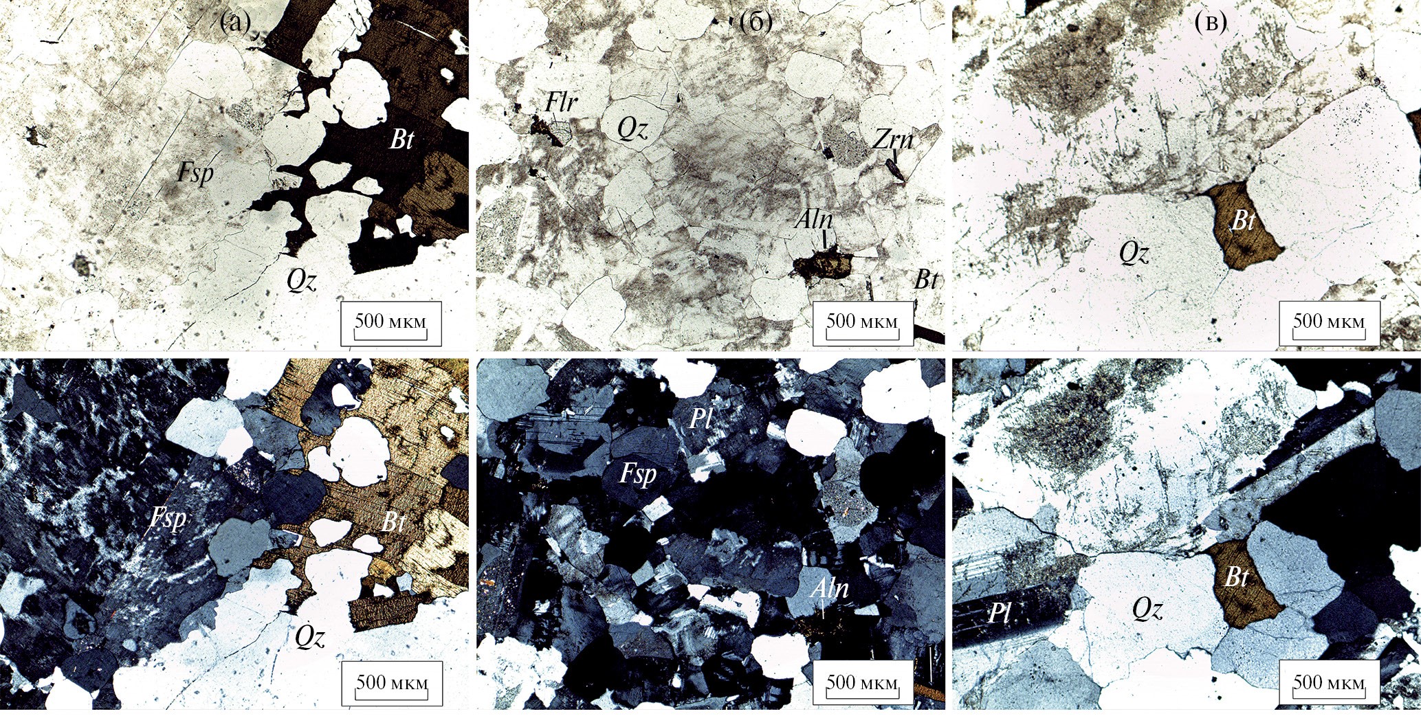 Рис. 1. Разновидности гранитов из месторождения Возрождение в прозрачно-полированных шлифах (верхняя часть рисунка – без анализатора; нижняя часть – с анализатором): а – выборгиты; б – аплитовидные граниты зоны контакта («форель»); в – трахитоидные граниты. Условные обозначения минералов: Qz – кварц; Fsp – K-Na полевой шпат; Bt – биотит; Pl – плагиоклаз An30–35; Zrn – циркон; Aln – алланит; Flr – флюорит.