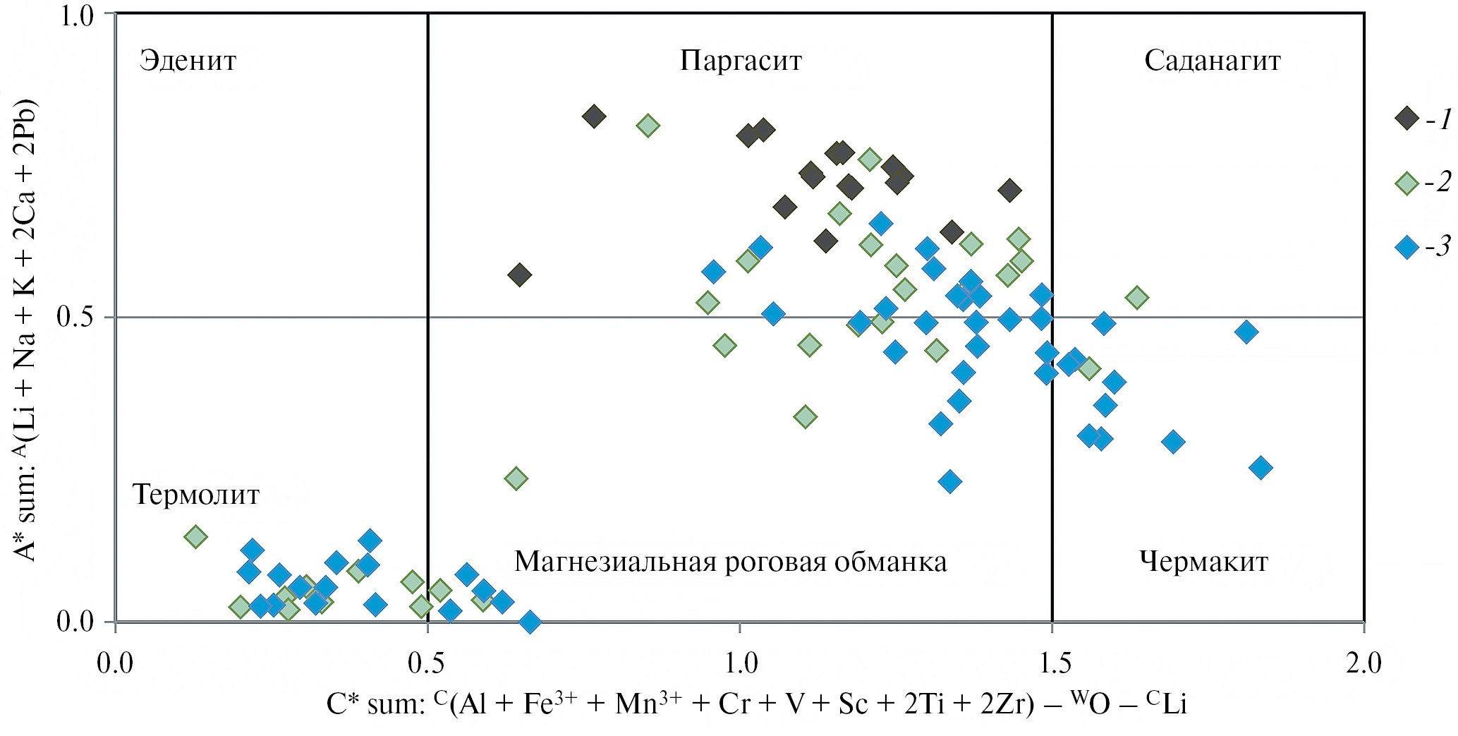 1 – составы предположительно магматических амфиболов пород первой фазы внедрения, 2 – составы метаморфических амфиболов преобразованных пород первой фазы внедрения, 3 – составы метаморфических амфиболов преобразованных пород второй фазы внедрения. Диаграмма и расчеты составов амфиболов по (Locock, 2014).