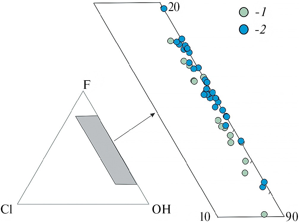 Апатит образует идиоморфные зерна размером 0.01–0.2 мм в амфиболе, биотите и, реже, в плагиоклазе, клинопироксене. Представлен рядом фтор-апатит – гидроксил-апатит (рис. 6). Может содержать незначительную примесь хлора (до 0.36 мас. %).