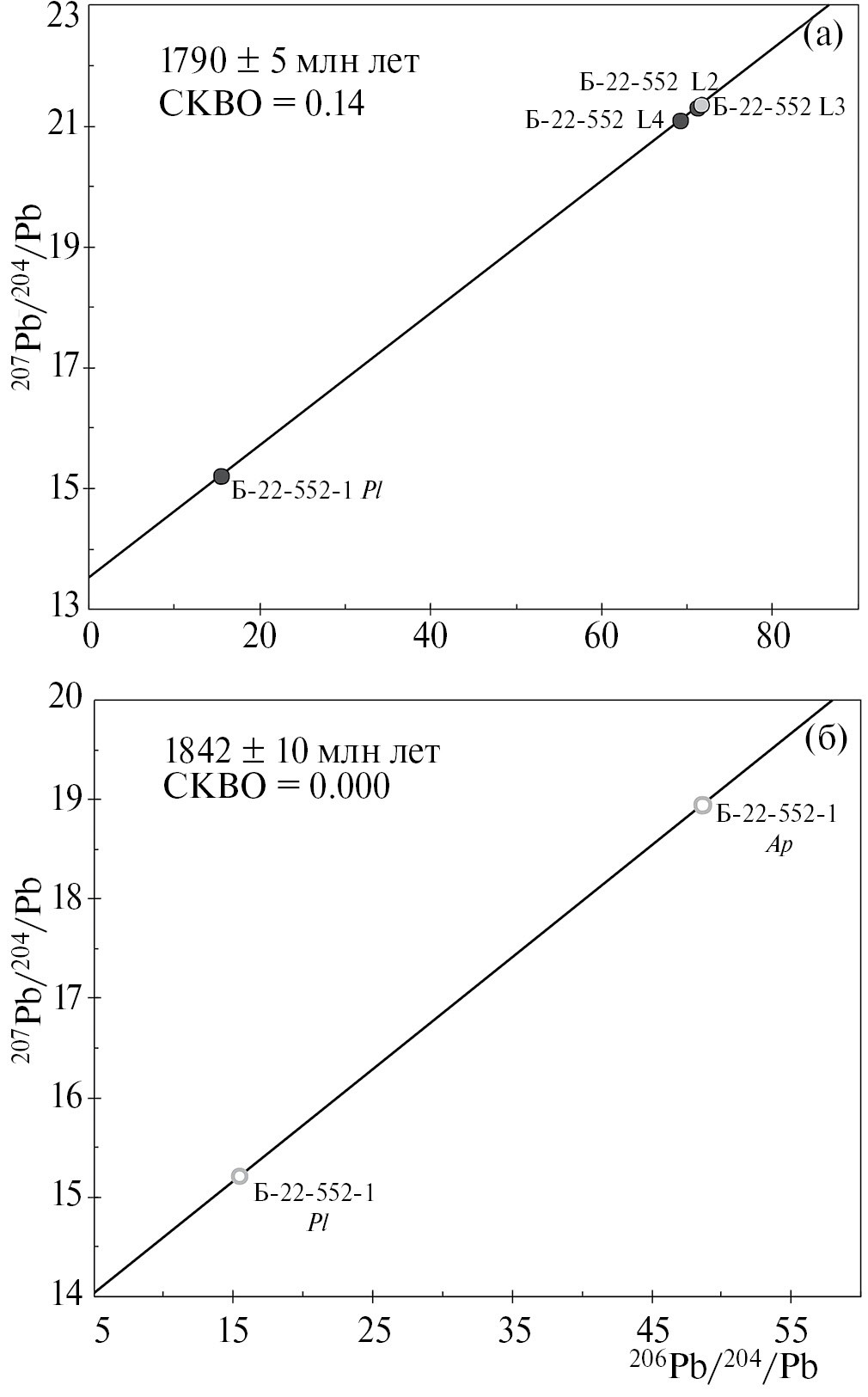 Изотопный U-Pb анализ минералов выполнен в ИГГД РАН. Для изучения U-Pb системы апатитов навески образцов (5–10 мг) растворялись в 1N HCl кислоте при комнатной температуре в течение суток. Одна проба апатита (Б-22-552) была подвергнута ступенчатому растворению. Эта навеска была предварительно отмыта в течение 20 минут при комнатной температуре в 0.1N HCl, затем последовательно растворялась в 1N HCl: 10 минут (L1), 20 минут (L2), 30 минут (L3), 40 минут (L4) и 1 час (L5). Изотопный состав свинца анализировался только у фракций L2, L3, L4, поскольку предполагалось, что фракция L1 могла быть контаминирована свинцом некогенетичных с апатитом фаз в виде продуктов более поздних наложенных событий, а фракция L5 – свинцом минералов – включений в апатите (возможно, некогенетичных).
