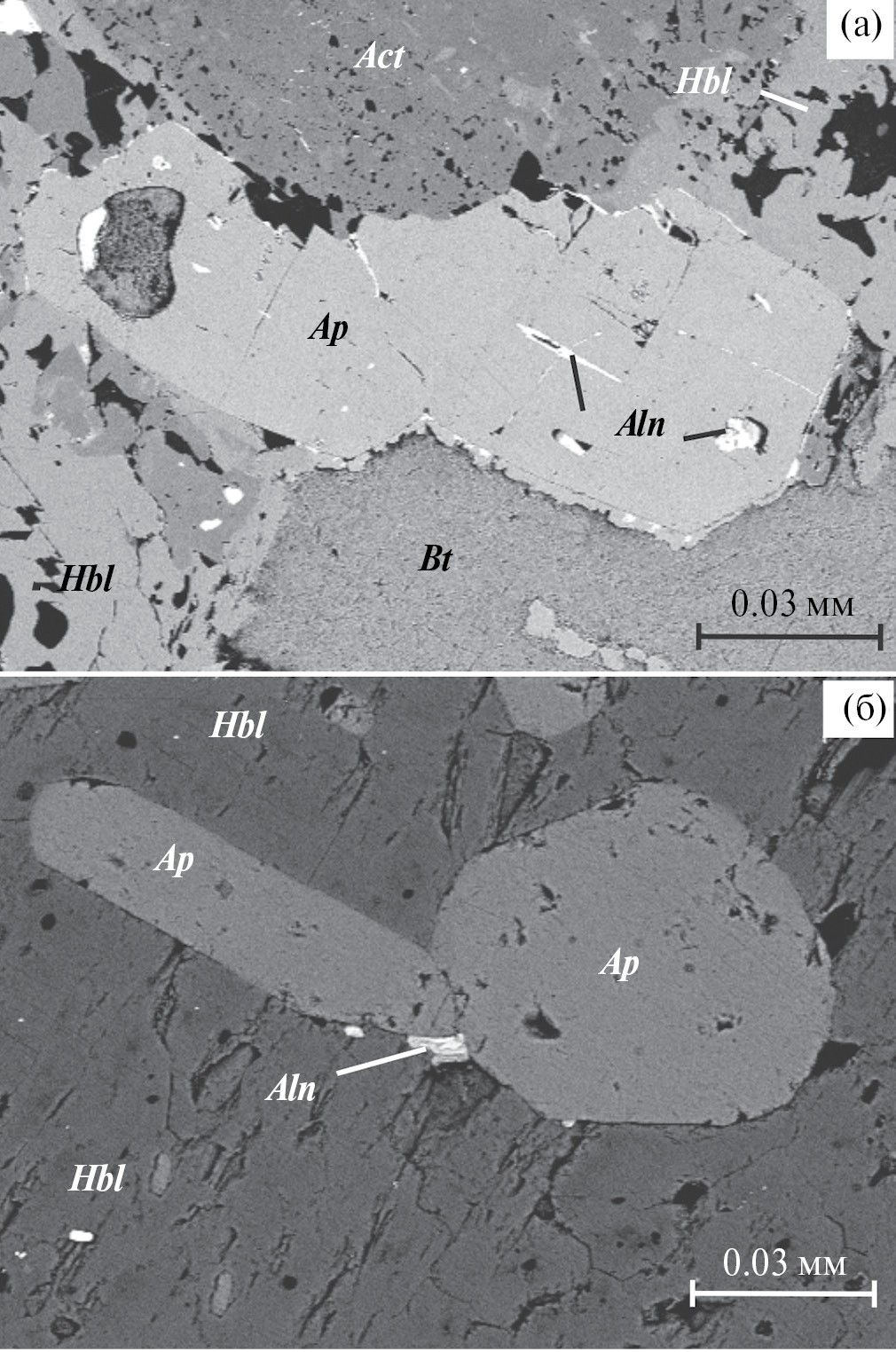 (а) – экссолюция (?) редкоземельного алланита при перекристаллизации апатита, (б) – алланит в контакте с зернами апатита в роговообманковом матриксе.