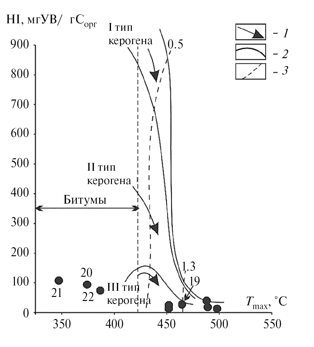 Рис. 1. Пиролитические характеристики органического вещества нерюенской свиты скв. Усть-Майская-366: 1 – направленность изменений величин HI и Tmax в катагенезе, 2 – линии, ограничивающие максимальные значения водородного индекса для трех типов органического вещества (I – аквагенного озерного, II – аквагенного морского, III – террагенного), 3 – изолинии Rovt, ограничивающие главную зону нефтеобразования; цифры курсивом соответствуют номерам образцов в табл. 1.