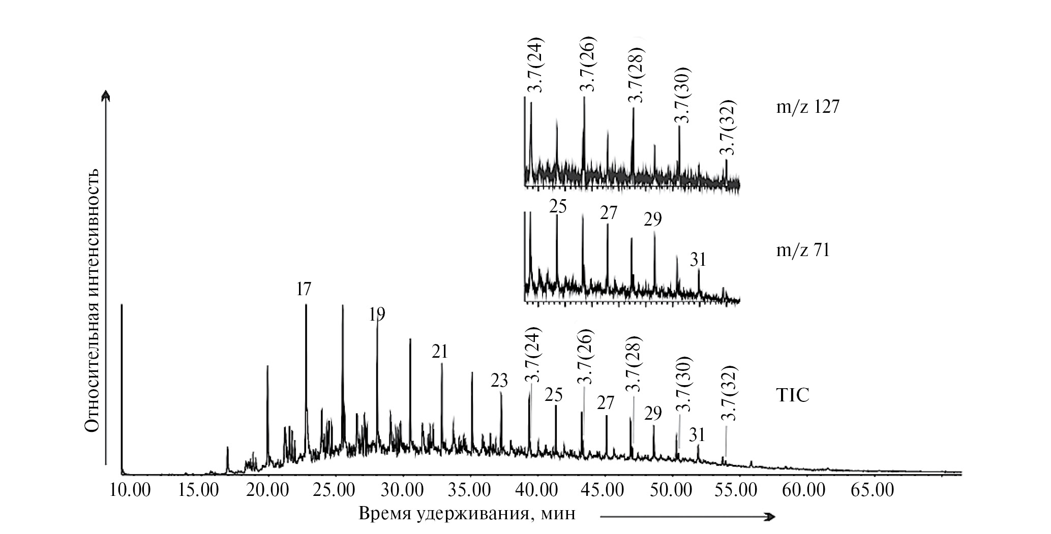 Рис. 2. Хроматограмма по общему ионному току (TIC) и масс-фрагментограммы терпанов по m/z 71 и m/z 127 в автохтонном битумоиде образца № 19 нерюенской свиты (17–31 – пики н-алканов, Pr и Ph – пристан и фитан, 3.7(24)–3.7(32) – пики 3-,7-диметилалканов).