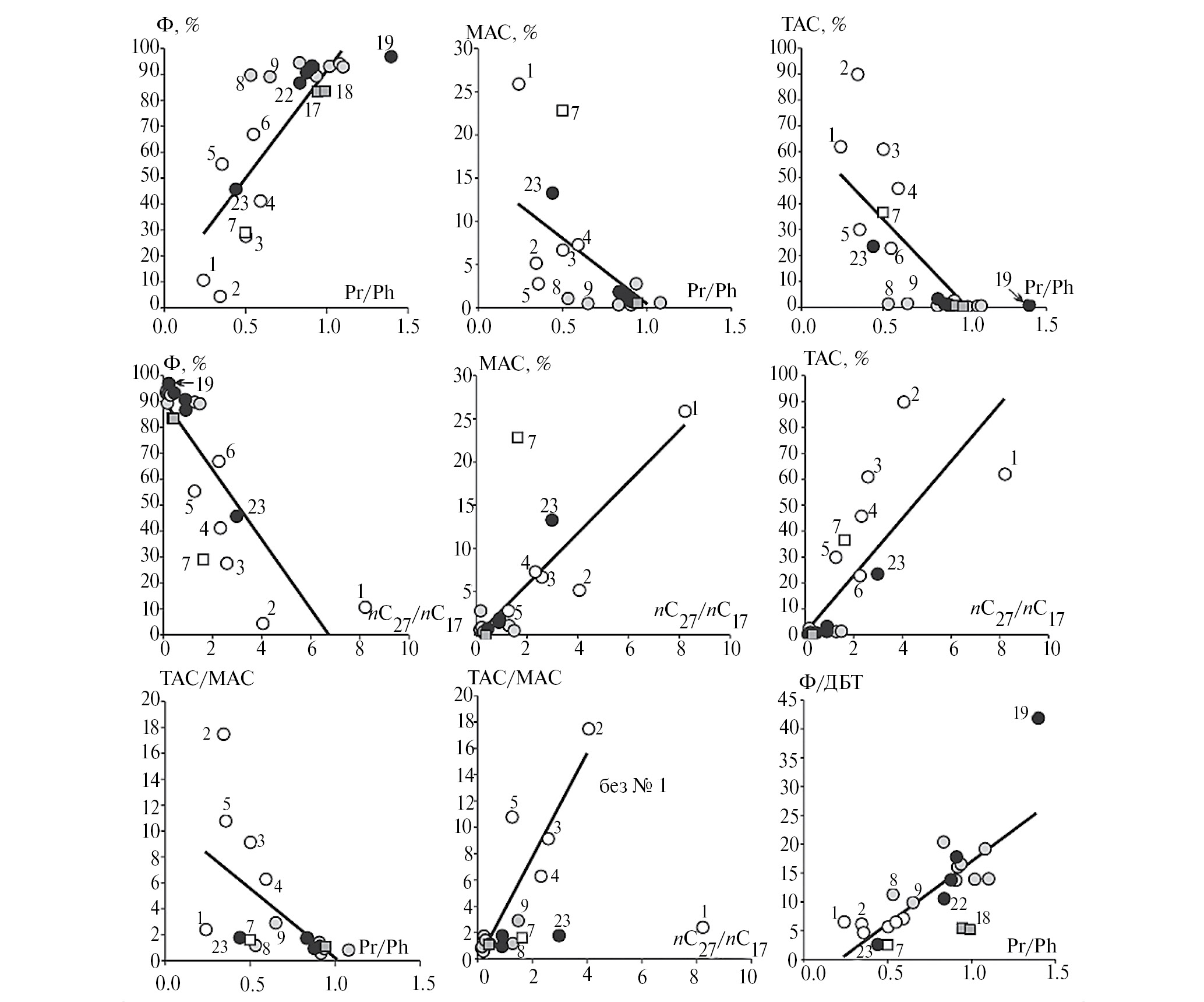 Прямо пропорциональные зависимости концентрации фенантренов (Ф) и обратно пропорциональные зависимости концентраций МАС и ТАС от Pr/Ph, видимо, отражают катагенетическую преобразованность, как и зависимости концентраций этих соединений от nC27/nC17. Образцы сарданинской и усть-кирбинской свит в основном обогащены ТАС (>20 %) и обеднены фенантренами (<70 %) (табл. 3, рис. 7). С отношением Pr/Ph коррелируют отношения Ф/ДБТ (прямо пропорционально) и ТАС/МАС (обратно пропорционально), и битумоиды сарданинской свиты на графике Pr/Ph – Ф/ДБТ лежат в области наименьшей преобразованности, а автохтонный битумоид нерюенской – в области наибольшей преобразованности. Битумоид открытых пор нерюенской свиты № 23 обычно расположен близ противоположного конца тренда от АвтБ № 19 и тяготеет к области расположения битумоидов сарданинской свиты (№№ 1, 2), претерпевшими рассеивание легких компонентов, вероятно, его состав обусловлен тоже потерей миграционноспособных форм. Судя по графику Pr/Ph – ТАС/МАС, коэффициент ТАС/МАС с увеличением катагенетической преобразованности уменьшается, что подтверждается и соотношением ТАС/МАС и nC27/nC17.