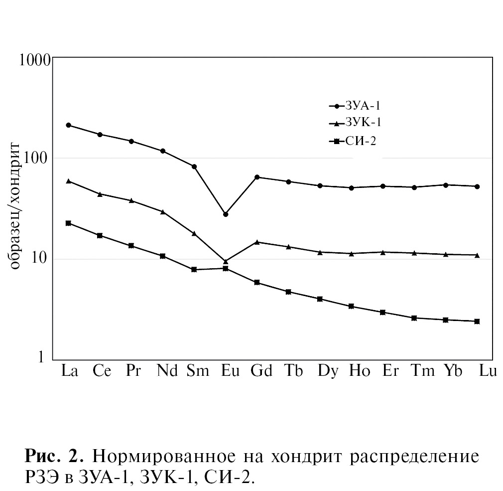 Полученные результаты позволяют представить нормированное на хондрит распределение РЗЭ не только в силикатных породах, но и карбонате СИ-2, а также в техногенных образцах ЗУК-1 и ЗУА-1 (рис. 2).