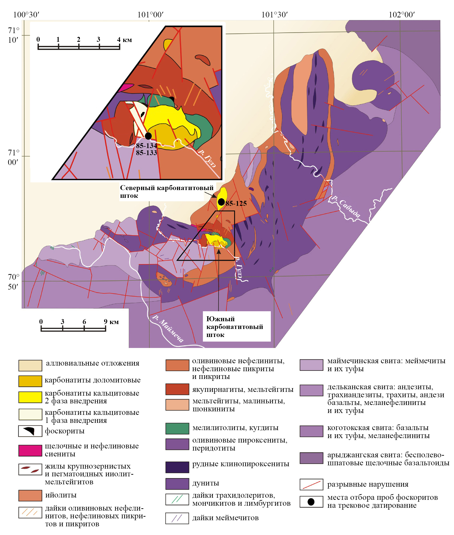 Гулинский щелочно-ультраосновной комплекс расположен на севере Сибирского кратона на площади около 500 км2, а по геофизическим данным – около 1600 км2 (Егоров, 1991). Ультраосновные породы составляют большую часть комплекса, штокоподобные тела ийолитов, фоскоритов и карбонатитов распространены на площади около 35 км2 в центральной и северо-восточной частях комплекса – Южный и Северный штоки (рис. 1). Породы формировались в следующей последовательности: дуниты, перидотиты, обогащенные магнетитом пироксениты (косьвиты), мелилитолиты, меланефелиниты и щелочные пикриты, якупирангит-мельтейгиты, ийолиты, щелочно-фельдшпатоидные и нефелиновые сиениты, фоскориты, кальцитовые карбонатиты двух фаз внедрения и доломитовые карбонатиты. Фоскориты – более ранняя фаза внедрения по отношению к карбонатитам, имеют аналогичный с ними минеральный состав, но обогащены фторапатитом (до 50 об. %), магнетитом (до 25 об. %), а в качестве темноцветных содержат минералы группы слюд, форстерит (до 35 об. %), монтичеллит, диопсид, клиногумит. Фоскориты и карбонатиты формируют крутопадающие жилообразные или штокверковые тела, секущие более ранние породы ийолит-карбонатитового комплекса – якупирангиты, метадуниты или рудные пироксениты (Егоров, 1992). Фоскориты также встречаются в виде ксенолитов в кальцитовых карбонатитах, форма фрагментов угловатая до округлой, размером от мелких до 30 см ксенолитов до крупных обломков с поперечным сечением до 5 м. Карбонатиты представлены кальцитовыми и доломитовыми разностями, при этом кальцитовые карбонатиты образуют две фазы внедрения. Минералы высокозарядных элементов в фоскоритах и кальцитовых карбонатитах первой фазы внедрения представлены перовскит-кальциртит-бадделеитовой ассоциацией, в карбонатитах второй фазы внедрения эти минералы ассоциируют с минералами группы пирохлора, торианитом и цирконолитом (Когарко и др., 2013).