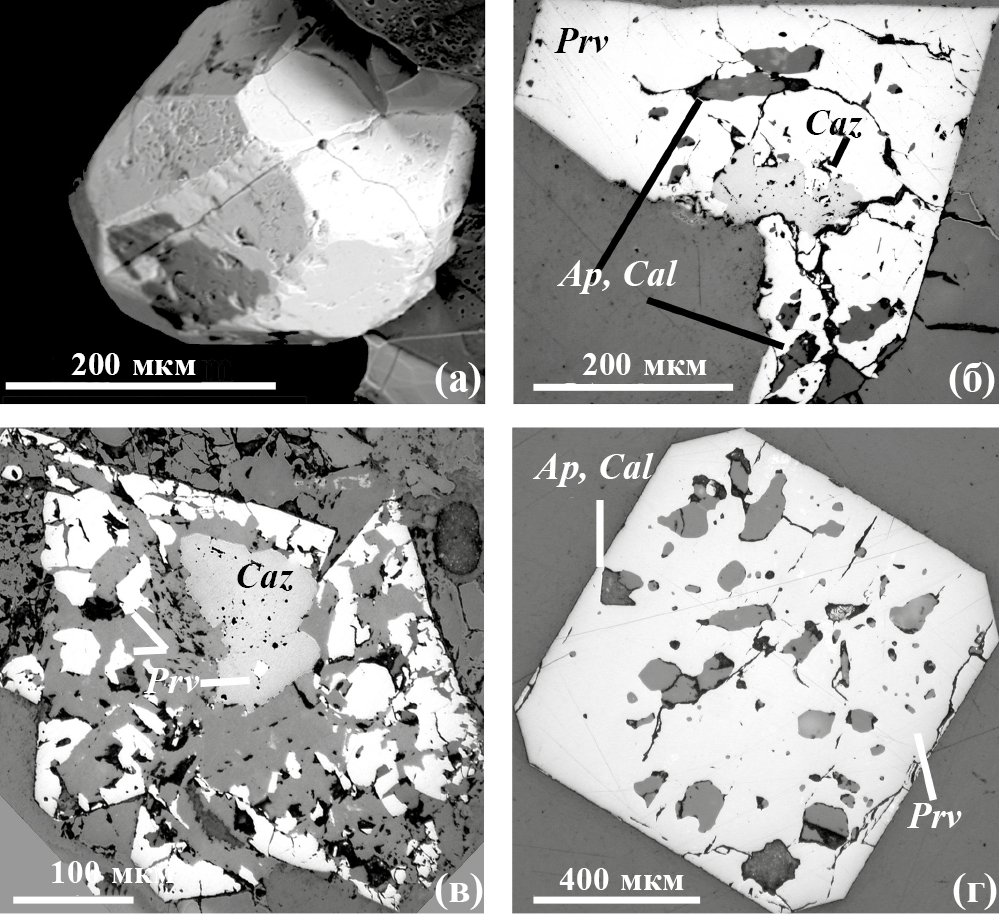 Рис. 2. Морфология и формы выделения кальциртита (Caz) и перовскита (Prv) из карбонатитов первой фазы внедрения: (а) – сдвойникованный кристалл кальциртита, изображение в отраженных электронах; (б) – обрастание кальциртита перовскитом и (в) – скелетные кристаллы перовскита поздней генерации (кальцитовый карбонатит первой фазы внедрения); (г) – псевдокубический кристалл перовскита (кальцитовый карбонатит второй фазы внедрения); оптическая микроскопия, изображение в отраженном свете. Cal - кальцит, Ap – фторапатит.