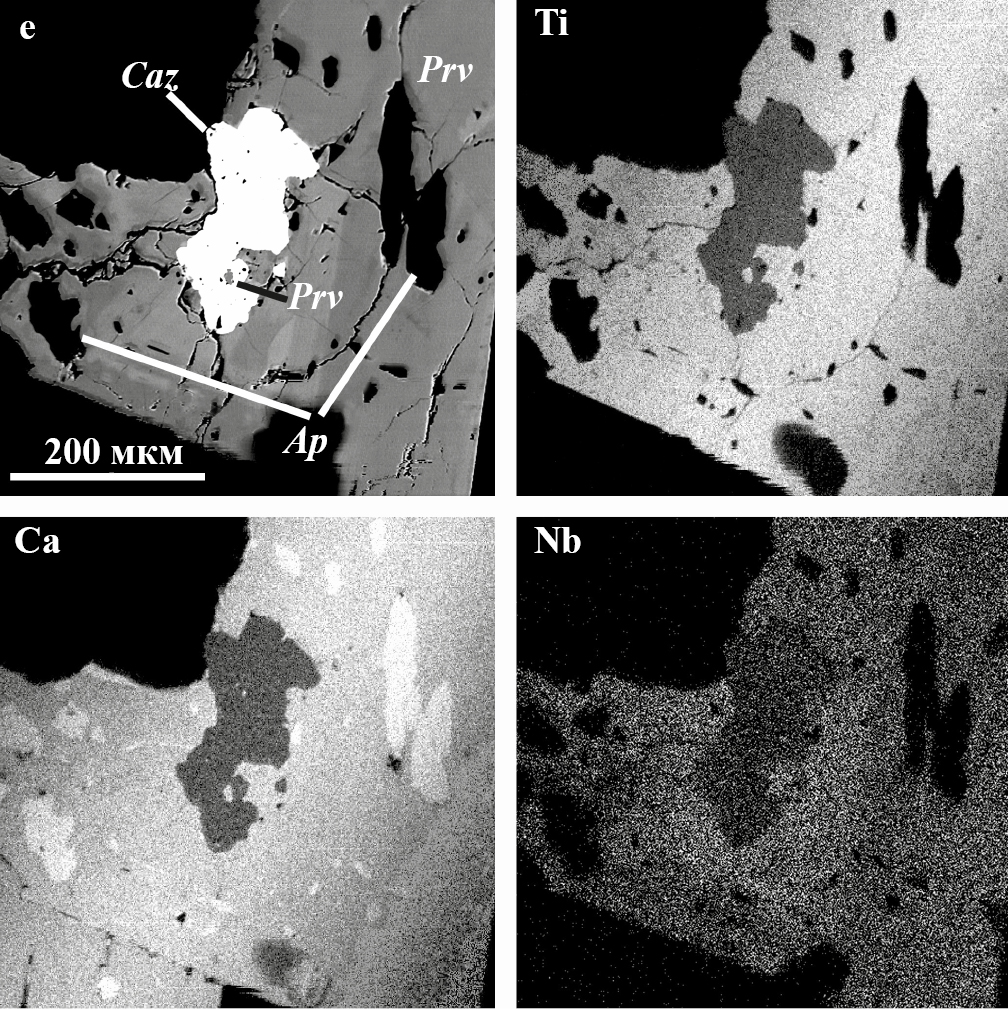 Рис. 3. Включение перовскита (Prv) ранней генерации в кальциртите (Caz) и нарастание на нем перовскита следующей генерации, кальцитовый карбонатит первой фазы внедрения. Изображение в отраженных электронах и характеристическом излучении указанных элементов. Ap – фторапатит.