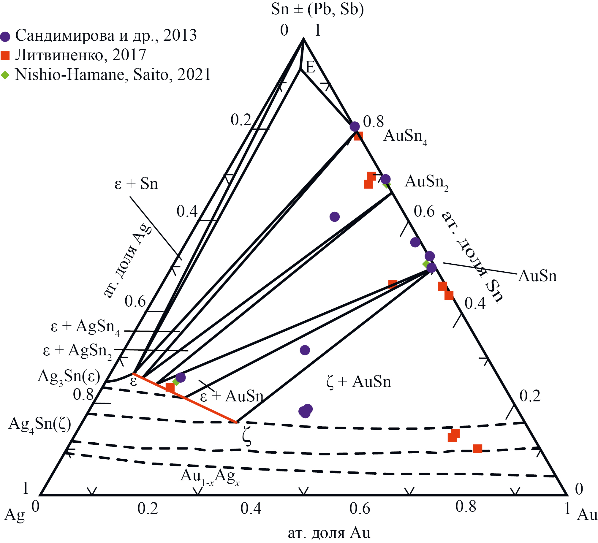 Рис. 1. Природные составы в системе Ag–Au–Sn(±Pb, Sb), в сравнении с экспериментальными данными в системе Ag–Au–Sn при 206 °С (Prince et al., 2006), E – тройная эвтектика.