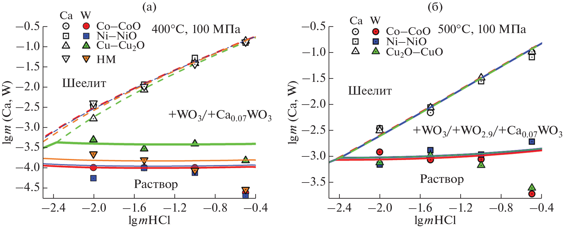 Experimental studies were carried out on the solubility of scheelite in HCl solutions in the concentration range from 0.01 to 0.316 mol•kg-1 H2O at 400 and 500°C, a pressure of 100 MPa and the fugacity of oxygen (hydrogen) specified by the buffers Cu2O-CuO, Fe3O4-Fe2O3, Ni-NiO and Co-CoO. It was found that scheelite in HCl solutions at the specified parameters dissolves incongruently. In solutions containing from 0.01 to 0.0316 m HCl, minor amounts of tungsten oxides WO3 and (or) WO3-x are found in the run products, along with scheelite. In solutions containing from 0.1 to 0.316 m HCl, the formation of calcium tungsten bronzes (CTB) CaxWO3 is observed, the average composition of which corresponds to the formula Ca0.07WO3. Based on the analysis of the experimental data obtained, the free energies of the formation of tungsten oxides WO3, WO2.9, scheelite and calcium of tungsten bronze were calculated. Using mutually agreed thermodynamic data, the solubility of Sch in solutions of HCl, (Na,K)Cl with the participation of alumino-silicates is calculated. It is shown that the scheelite has a wide area of congruent solubility in saline systems.