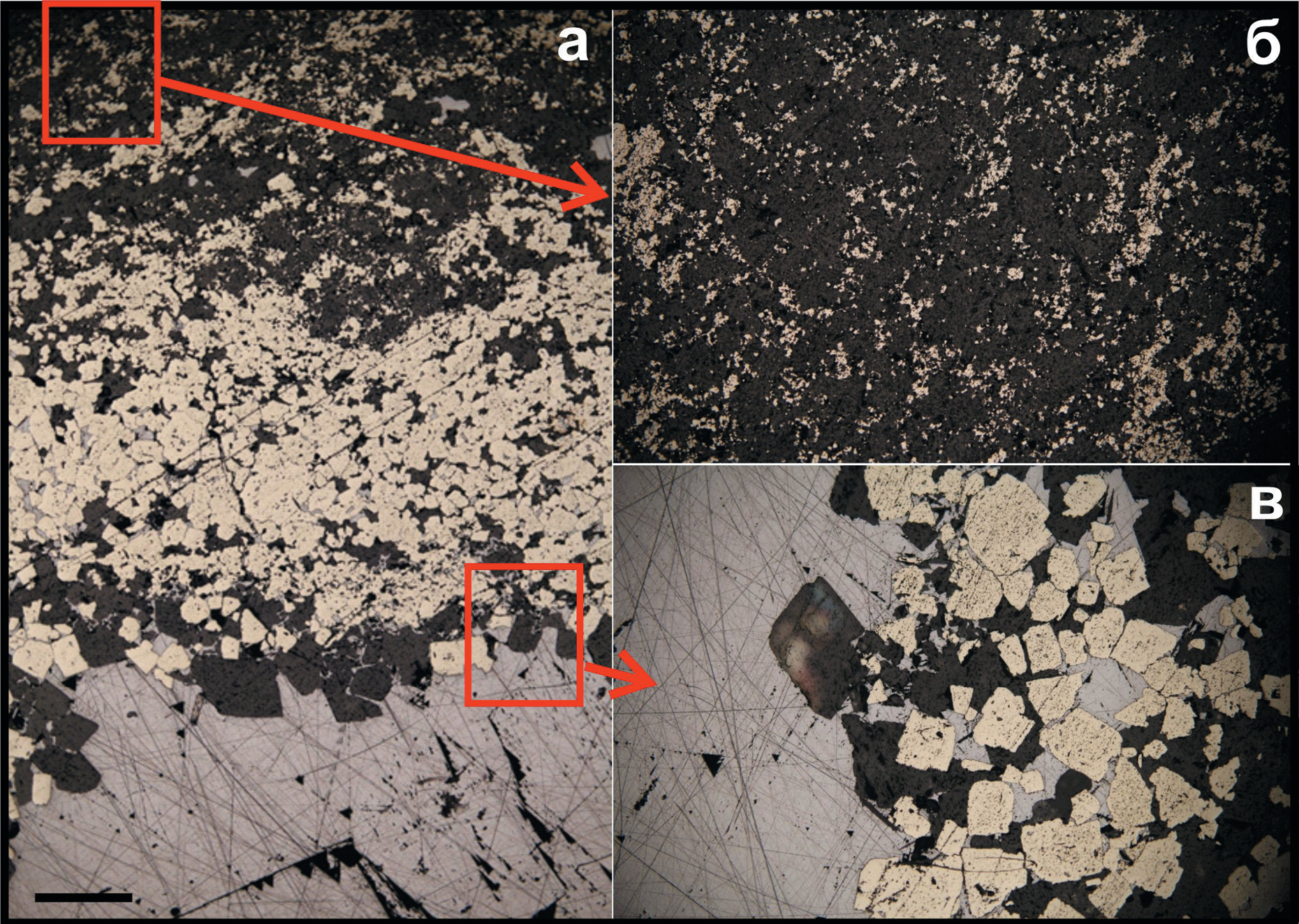 Фиг. 3. Микрофотографии руды Озерного месторождения. а – общий вид руд, где при перекристаллизации происходит укрупнение минеральных зерен и появляются участки сплошных галенитовых агрегатов; б – увеличенный фрагмент аншлифа (красный квадрат) с участком мелкозернистой руды, в – увеличенный фрагмент участка аншлифа, где наблюдается переход к сливным галенитовым рудам. Длина линейки – 0.2 мм.