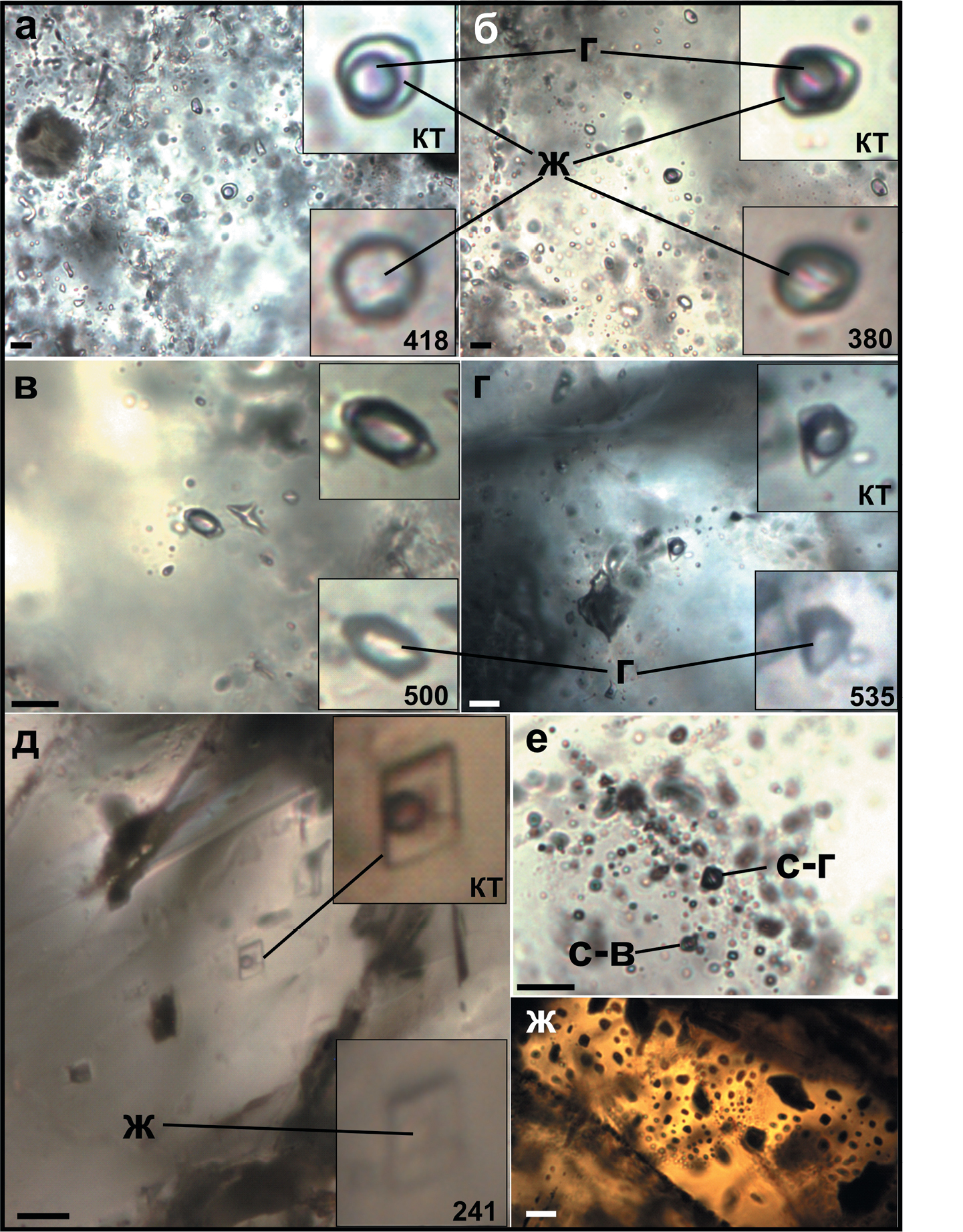 Фиг. 8. Фотографии первичных двухфазовых флюидных включений. а, б – одиночные флюидные включения округлой изометричной формы в кварце, общий вид и увеличенные фото ФВ при комнатной температуре (КТ) и при температуре гомогенизации в жидкость (Тг указана цифрами); в, г – флюидные включения в кварце, гомогенизирующиеся в газ; д – первичное флюидное включение в сидерите; е – группа относительно мелких сингенетичных существенно-водных (С-В) и существенно-газовых (С-Г) ФВ; ж – многочисленные газовые включения в зерне сфалерита. Длина линейки – 10 мкм.