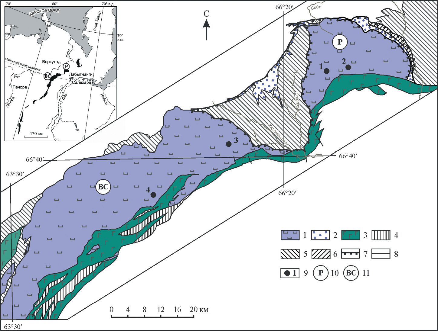 Фиг. 1. Схема расположения ультрамафитовых массивов Рай-Из и Войкаро-Сыньинский (по Зылёва и др., 2014, Савельева и др., 2015; Вахрушева и др., 2017). Условные обозначения: 1 – ультрамафиты райизско-войкарского комплекса; 2 – серпентинитовый меланж; 3 – кэршорский дунит-верлит-пироксенит-габбровый комплекс; 4 – комплекс диабазовых даек; 5 – метаморфические комплексы; 6 – осадочные комплексы; 7 – региональные сдвиго-надвиги и сдвиго-взбросы; 8 – границы разновозрастных образований; 9 – изученные хромоворудные объекты: 1 – месторождение Центральное, 2 – рудопроявление Енгайское-1, 3 – рудопроявление Аркашорское, 4 – Ямботывисские рудопроявления; 10, 11 – ультрамафитовые массивы: 10 – Рай-Из, 11 – Войкаро-Сыньинский.